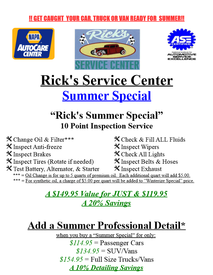 Rick’s Service Center & Towing is a trusted auto repair shop known for honesty, quality, and great value. The business offers the lowest labor rates in the area and is staffed with three ASE-certified master technicians skilled in modern automotive technology. They handle most domestic vehicle repairs with professionalism and efficiency. Customers appreciate the quick and responsive service, often praising how their cars are repaired in a timely manner. The staff is described as professional, knowledgeable, and cooperative, providing friendly assistance and ensuring vehicles are safe and ready to go. Many reviews highlight the shop’s ability to help in urgent situations, such as roadside breakdowns, and their willingness to work with customers’ needs. Overall, Rick’s Service Center has built a strong local reputation for trustworthy, fast, and caring service that keeps customers coming back.