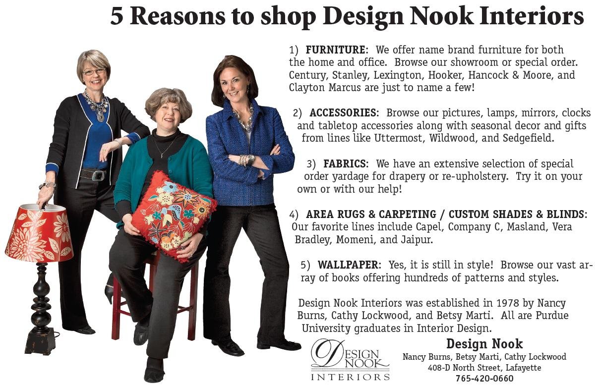 We’re Design Nook Interiors, and we’ve been in Lafayette, IN, since 1977. We offer interior design, furniture, blinds, custom drapery, lamps, decorative accessories, wallpaper, and more. We believe in paying personal attention to our customers by building an interpersonal rapport with them throughout the design process. We would like to invite you to stop by to see our new and everchanging showroom!