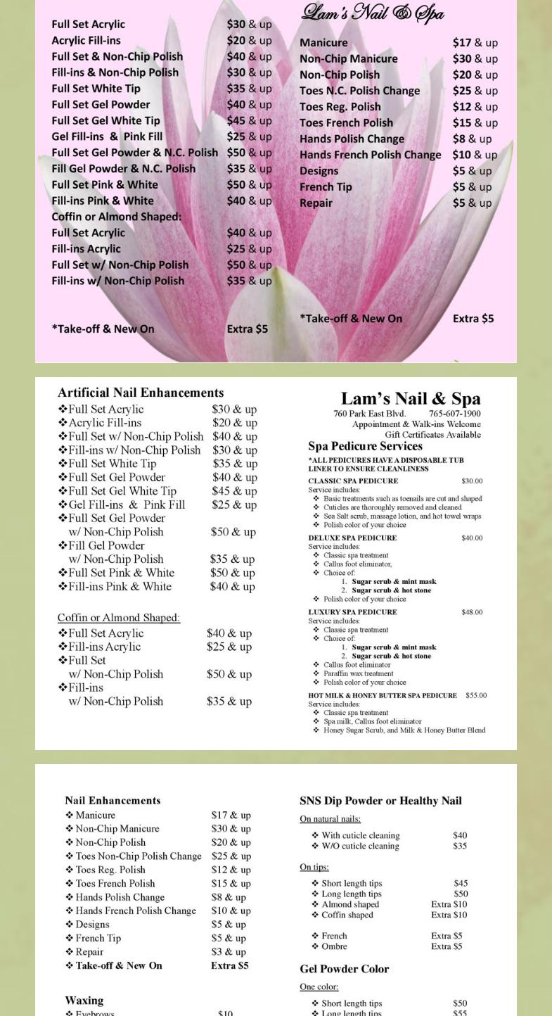Let us pamper you! Let’s visit, have a relaxing time, and become prettier after enjoying high-end services at one of the best Nails Salons in Lafayette Nails & Spa. Conveniently located in Lafayette, Zip Code 47905, Lam's Nail and Spa is proud to deliver the highest quality treatments to our customers. Our salon takes pride in providing our valued customers all good services and top-high quality products as well as materials. You can find all nail-related services, from Manicure, Pedicure to Nail Add-on. At Lam's Nail and Spa, a wide choice is provided to customers, so you can use any services that you like. All of our services are at decent prices, so there is no hesitation when you use one or even more services at our salon.
