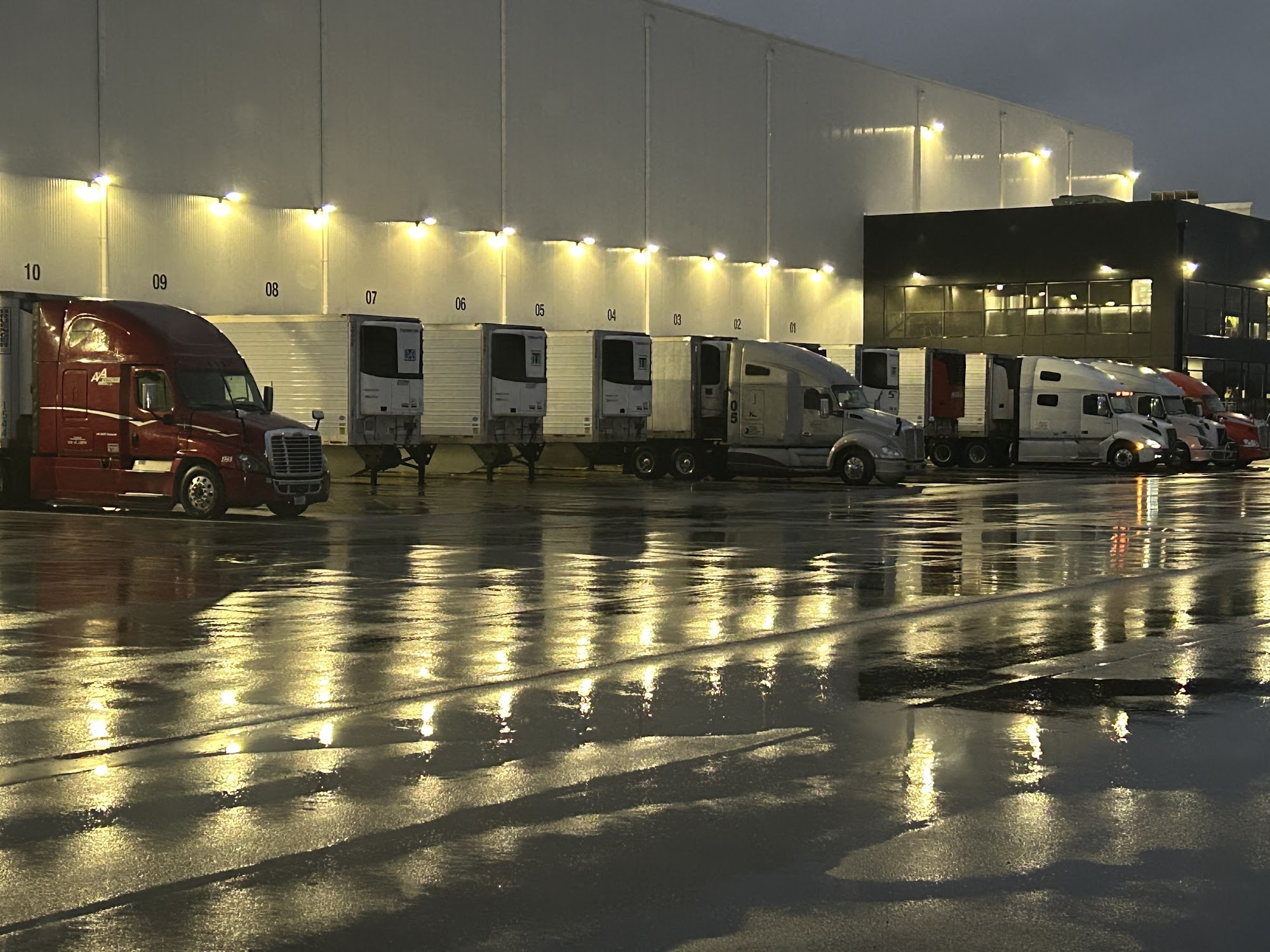 Newcold Advanced Cold Storage Logistics is a busy facility that handles cold storage and logistics services. The location is under ongoing construction, with clear signs guiding drivers through the process. Upon arrival, drivers must check in at a kiosk, providing their PO number and trailer details. Although the kiosk intercom at the front entrance is broken, staff can be reached by phone if needed. Inside, drivers receive a LOT number to drop off their trailer and then follow signs to the shipping and receiving office, located in the All Black Building. The check-in process involves filling out a form, and staff are generally friendly and helpful, making for a smooth experience. Parking is not available overnight, with nearby options like Pilot and McClure Oil. The facility allows for easy in and out, provided drivers pay attention to signage. Trailers can be positioned with tandems slid to the rear and reefer units set correctly, ensuring proper handling of refrigerated loads. The layout provides ample space for maneuvering, even amid construction. Typically, drivers can be assigned a door quickly, especially if they check in early, and waiting times vary depending on workload, sometimes taking a few hours. Exiting the facility requires calling for re-entry if returning with an empty trailer, as PO numbers expire after leaving. Overall, Newcold offers efficient service with friendly staff, and despite ongoing renovations, drivers find the process manageable with proper attention to signs and procedures.