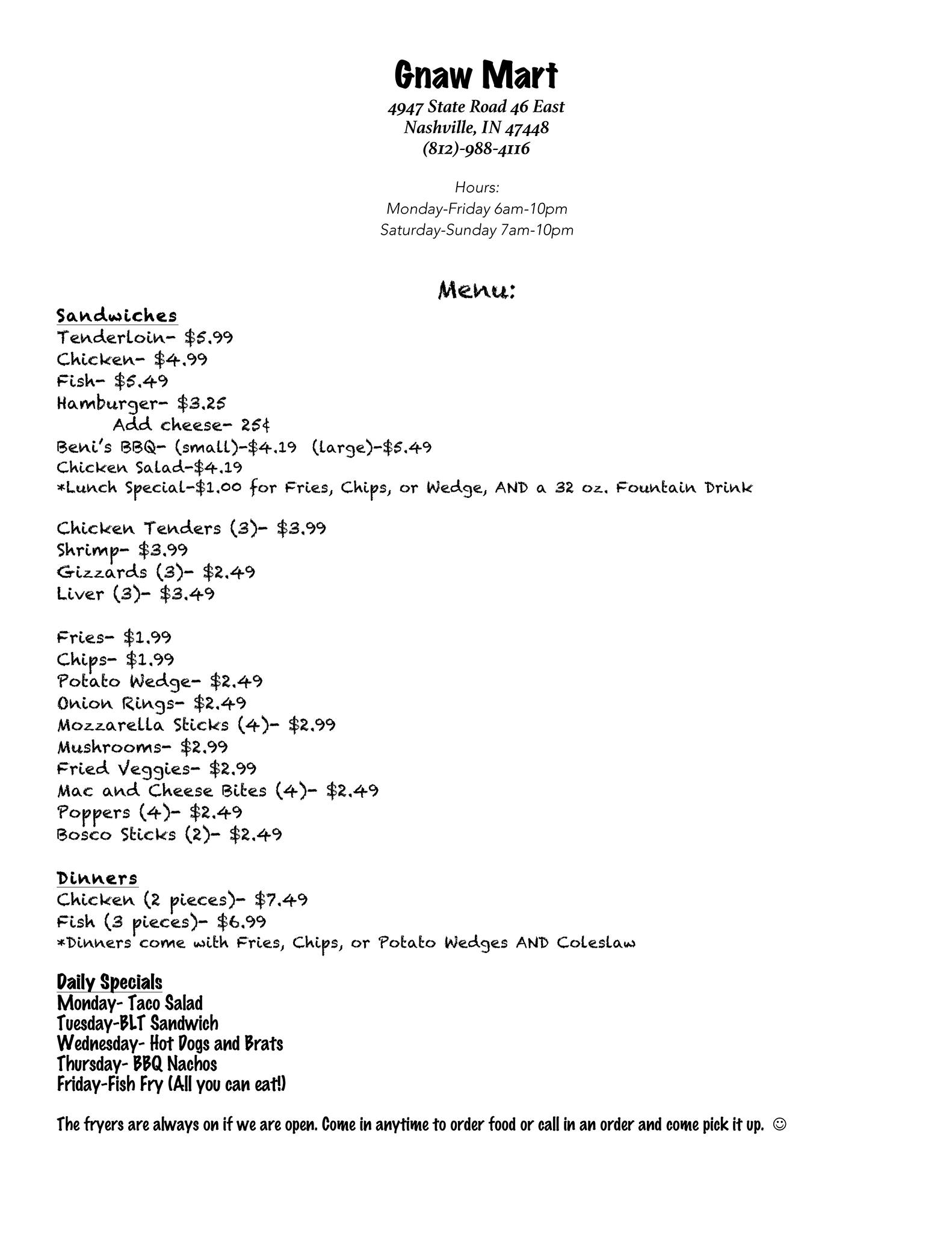 GNAW MART is a friendly and welcoming business that offers delicious food, especially their well-loved tenderloin sandwiches. Customers praise the tenderloin for being thick, crispy, and well seasoned, often served with classic toppings like lettuce, tomato, and pickles. The menu also includes fried mushrooms, BBQ sandwiches, and tater wedges, all enjoyed at outdoor picnic tables. Visitors appreciate the reasonable prices, with some noting their meals cost around nine dollars, and enjoy extras like free drinks. The staff are courteous and hospitable, making guests feel comfortable and cared for. The business is conveniently located, making it a great stop for a day trip from nearby cities. Beyond food, guests find the facilities impressive, especially the bathroom with natural light and cool features that enhance comfort. Overall, GNAW MART provides a pleasant experience with good food, friendly service, and a welcoming atmosphere, making it a worthwhile destination.