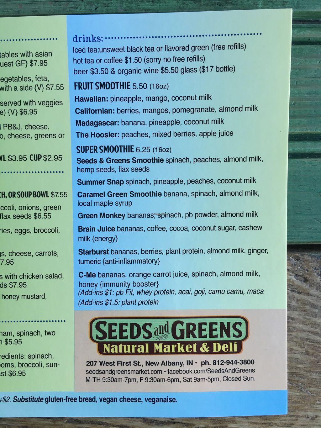 Seeds and Greens Market is a health food store with a cafe. We sell organic and natural groceries, grass fed meats, local eggs, honey, produce, cooking & baking items, healthy snacking, bulk tea & spices, beer, & wine. We carry CBD, healthful home products, health & beauty products, nutritional supplements and fair-trade gifts. We have seating for 50, including a private room you can reserve and a beautiful outdoor garden cafe with seating for 45 (also available to rent). Our menu has 30+ items: sandwiches, paninis, salads, soup, hummus plate, bean burgers, chicken salad, smoothies, coffee drinks, lattes, and more. Our menu includes options for meat eaters, vegans, vegetarians, with keto & gluten-fee choices.