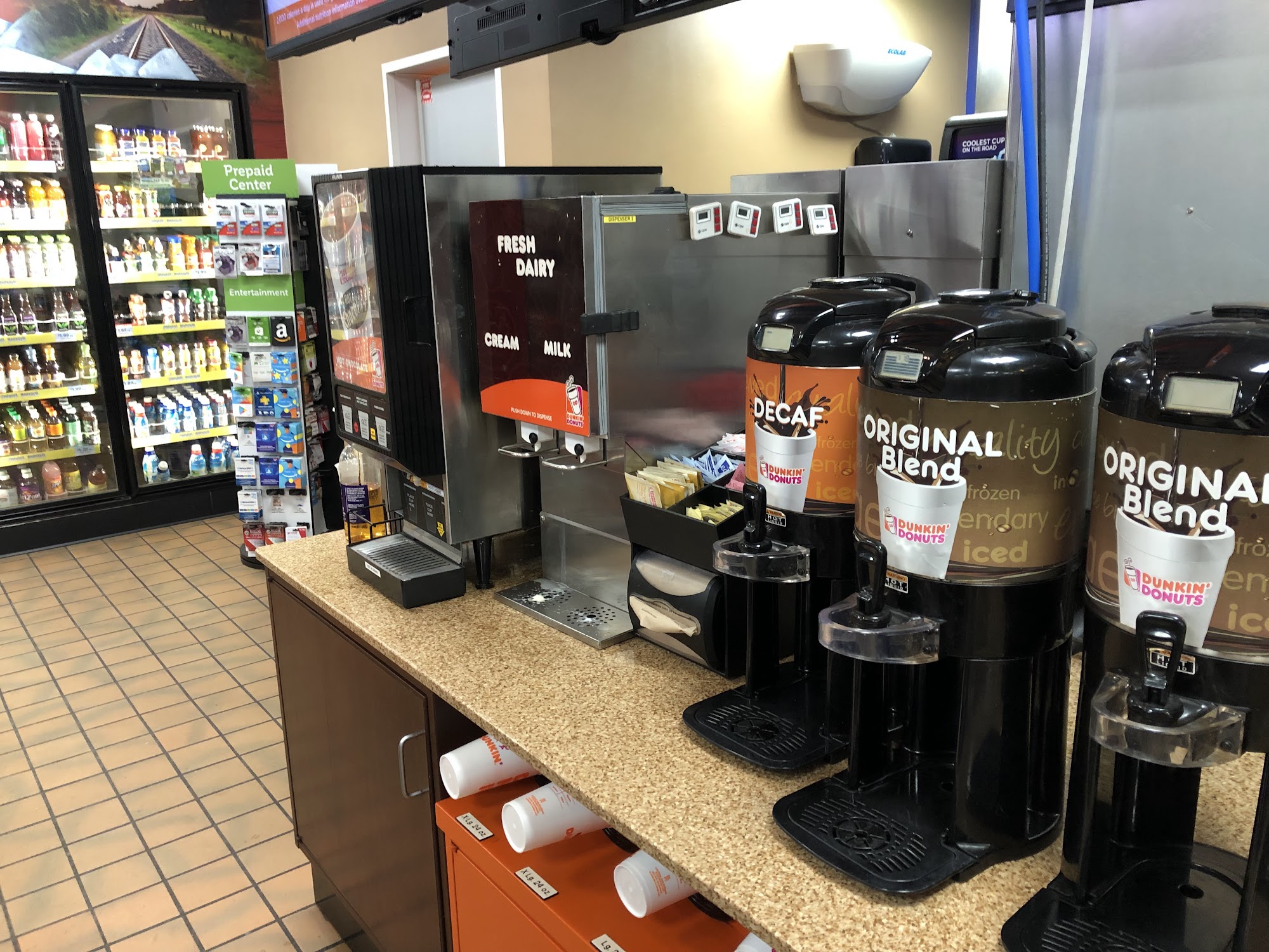 Quick gas fill up and less congested than other lots in the area. Nice convenience center with cold beverages and snacks, and clean restrooms. Personable clerks are quick and professional. Back on the highway in a few minutes.