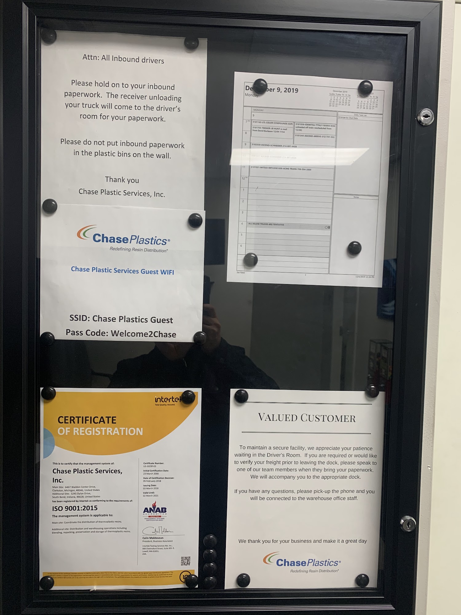 Chase Plastic Services, Inc. is a professional and well-organized facility. Drivers report it is a great place to deliver or pick up a load. The process is efficient, with staff sorting drivers at the gate and providing a dock door promptly. Unloading is typically completed quickly, often in under 25 minutes. The staff is noted as being nice and helpful, willing to assist with issues. The facility maintains extremely clean bathrooms and a clean break room for drivers. It is considered a good place where professionals value drivers' services and work to keep freight moving.