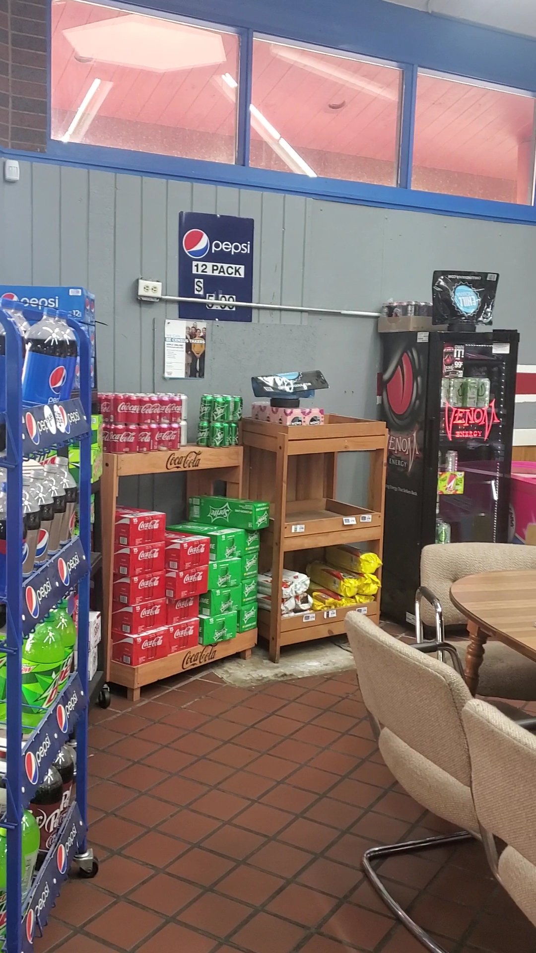 The bathroom is always disgusting. Unfortunate considering this is the only gas station in the area.