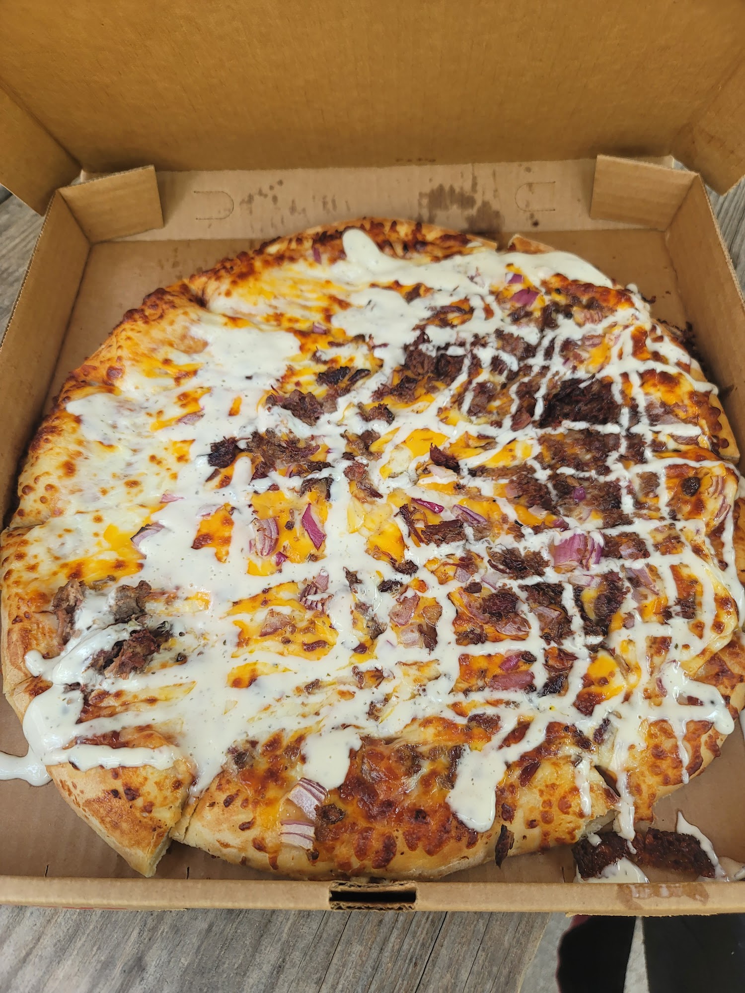Ordered a large pizza sausage onion and black olives opened it when we got home no onion no black olives very little sausage it might as well have been a cheese pizza.