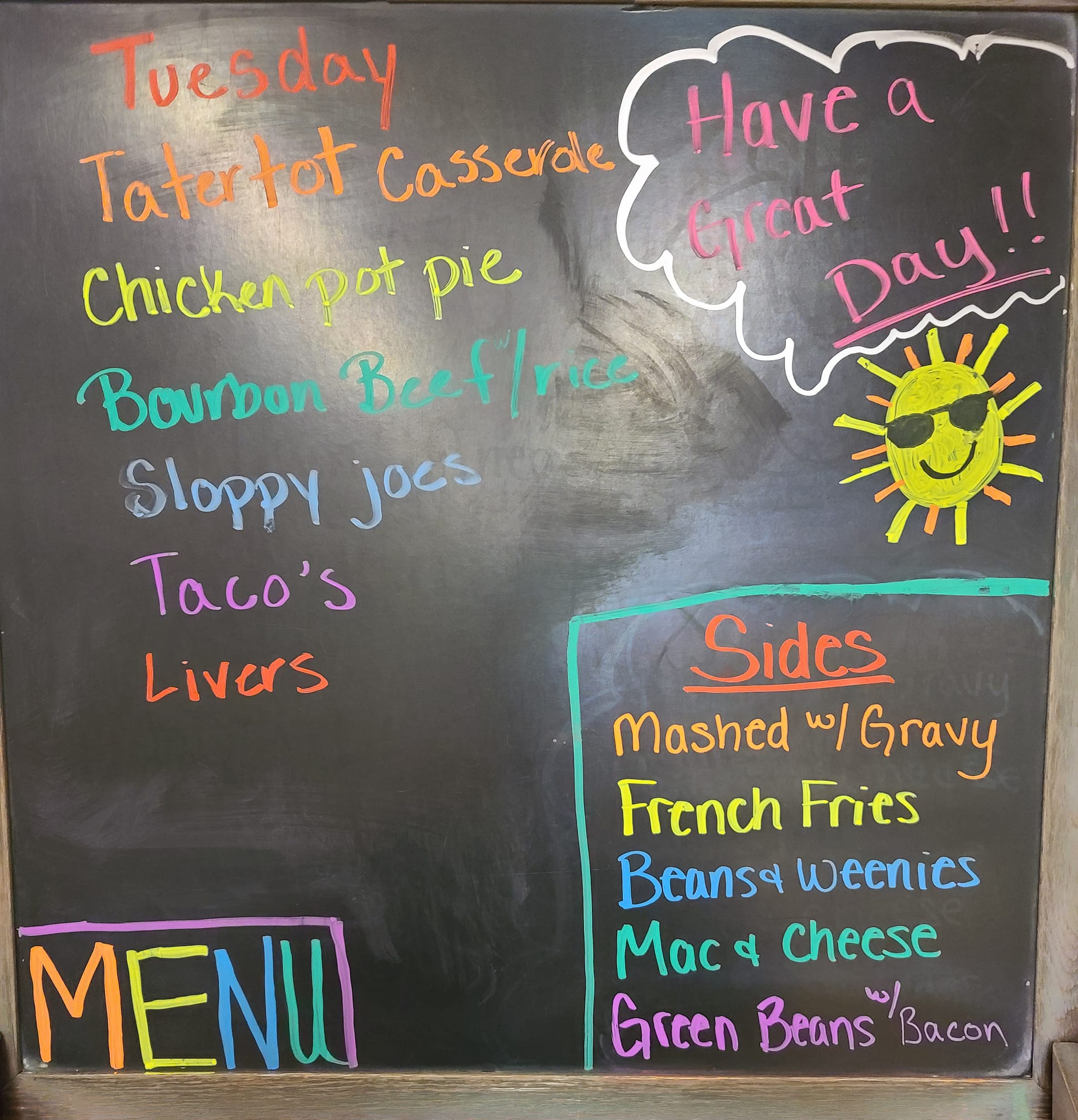 Good hot food as well as ham salad. The girl in the chicken hat back in the kitchen area is a sweetheart.. I need to ask her her name next time I'm in there.