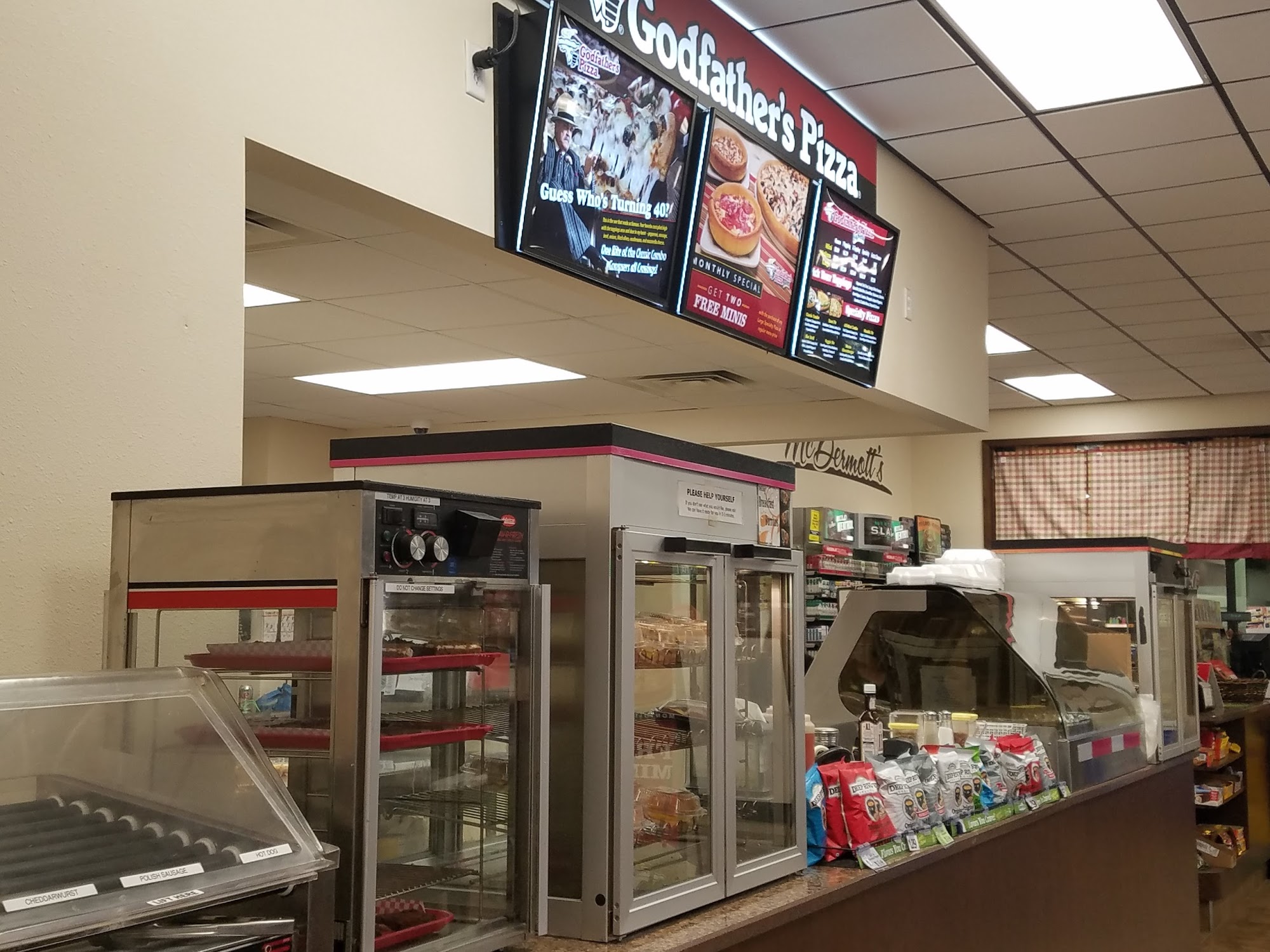Nice little truckstop, lots of parking. clean and friendly, looks like some kind of deli, and Godfathers pizza there's a shower for $10. Nice little place.