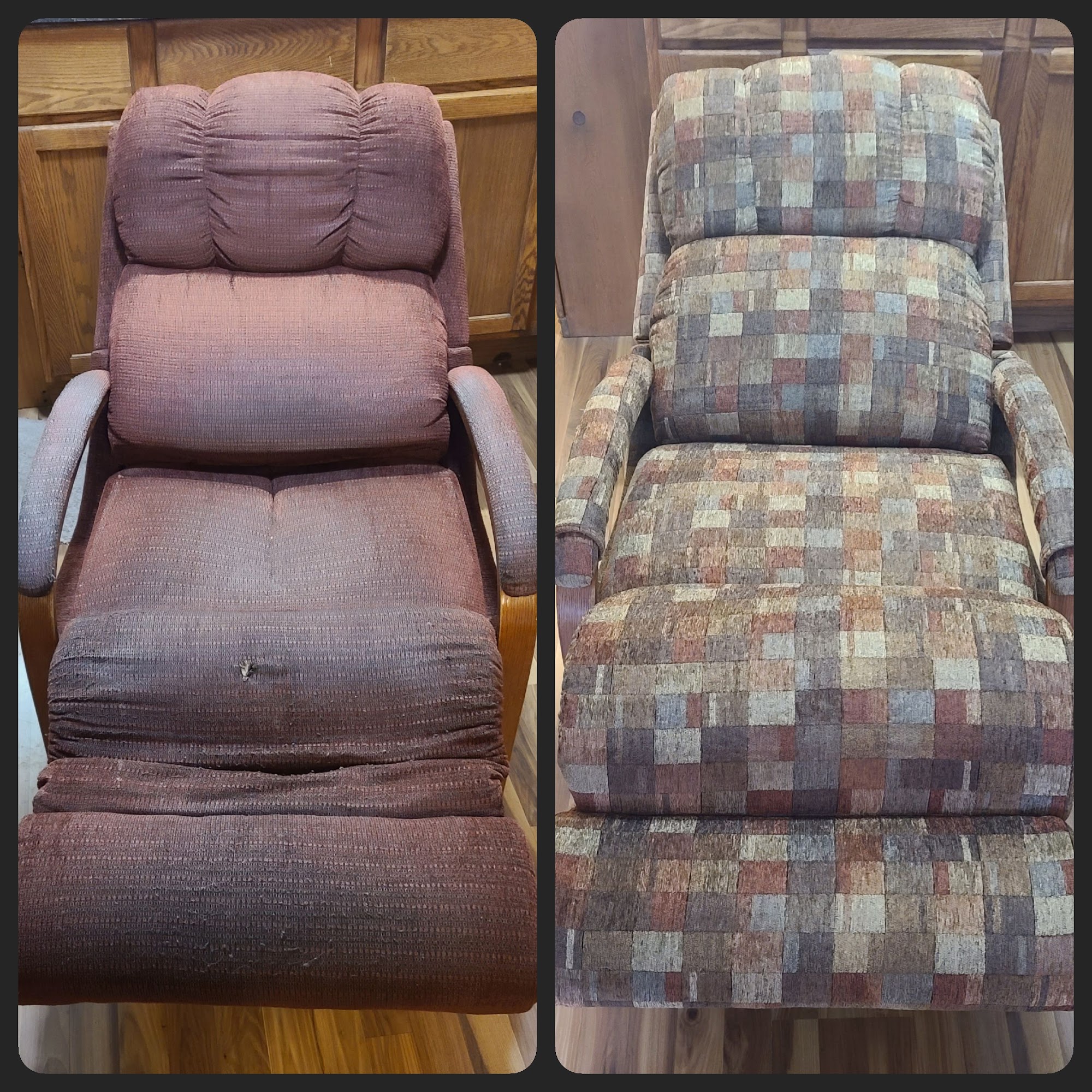 Before and after photos of my 25+ year old La-Z-Boy recliner we got back from Diamonds Upholstery in Shell Rock. Highly recommend, Diane is such a pleasure to work with and does awesome work! Very timely and accommodating, She stands behind Her affordable quality work.