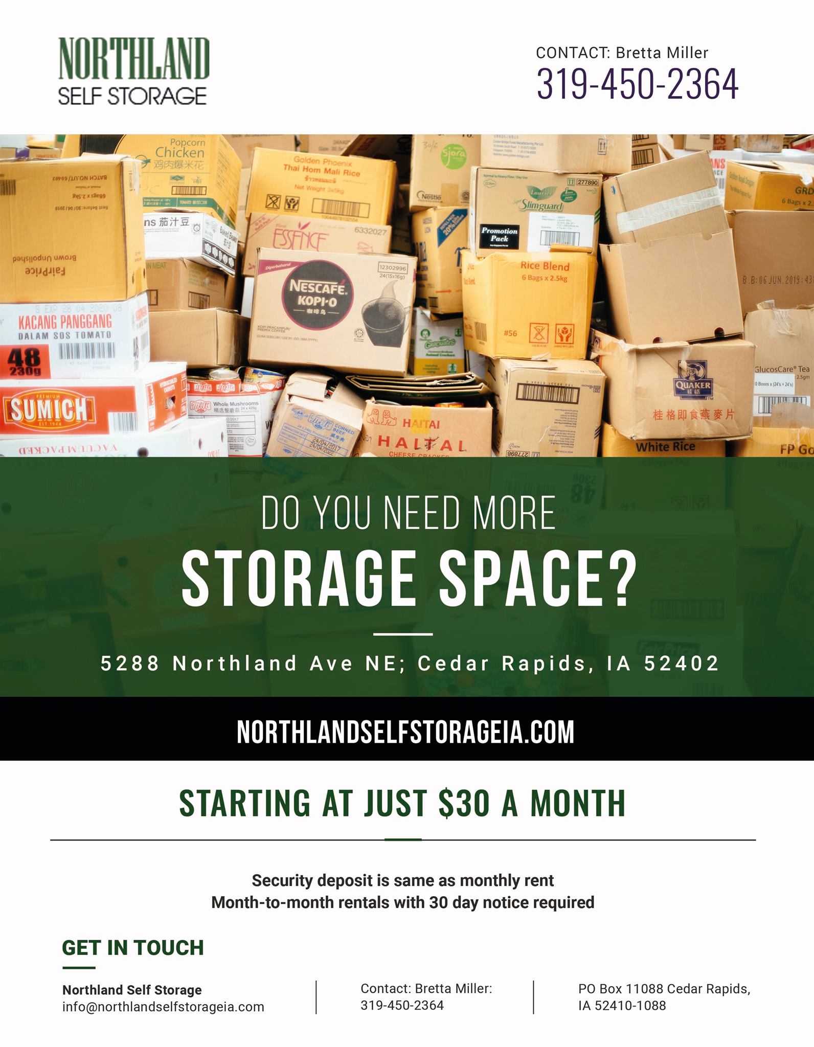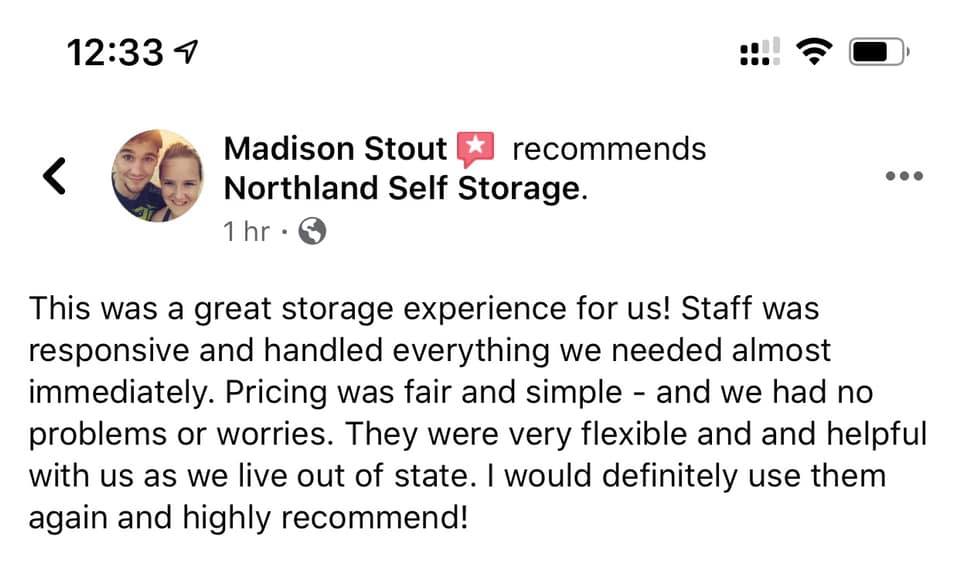 Northland Self Storage offers storage units for rent of many different sizes from small 4x4 units up to 12x24 units and many sizes in-between. Our great location, affordable pricing and superior customer service makes us the perfect choice for your storage needs. We do not have an on-site office so please call, text or email us for an appointment to visit. Our customers are the most important part of our business. Thank you for considering us for your storage needs.