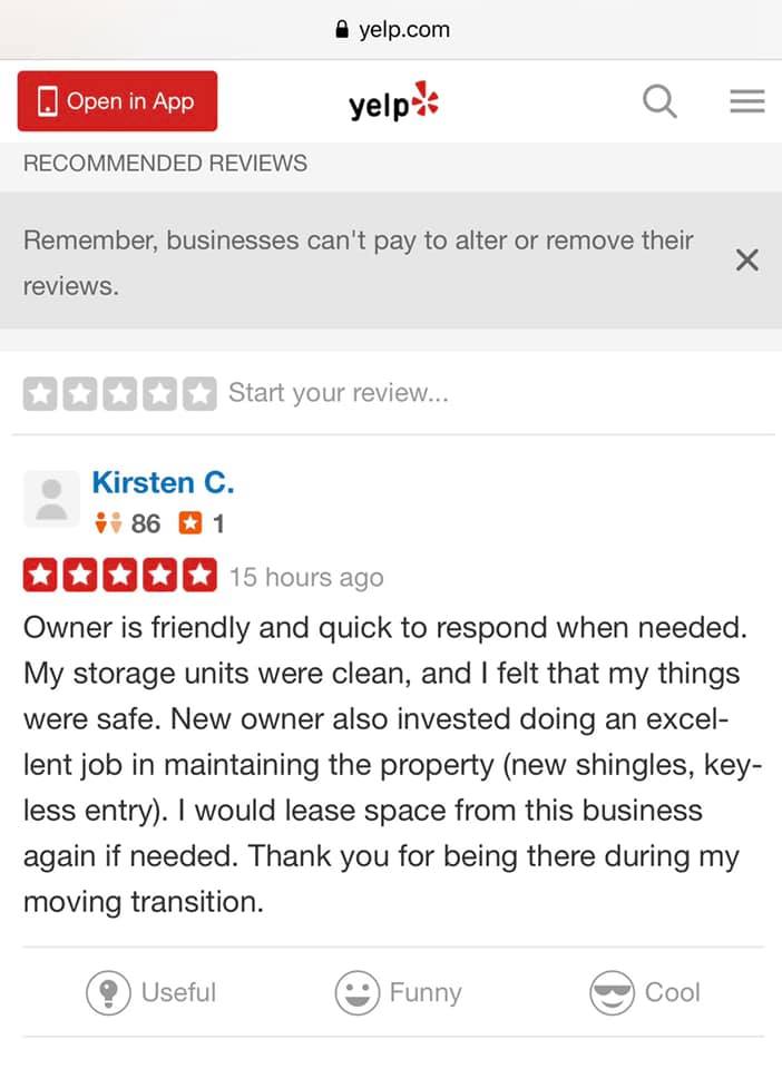 This was a great storage experience for us! Staff was responsive and handled everything we needed almost immediately. Pricing was fair and simple - and we had no problems or worries. They were very flexible and and helpful with us as we live out of state. I would definitely use them again and highly recommend!