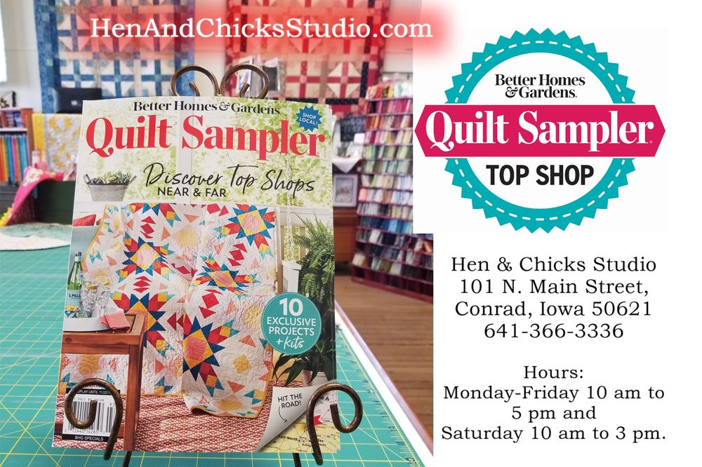 Hen & Chicks Studio is a full-service quilt shop in Conrad, Iowa. We also have two fully-equipped retreat centers for scrapbookers and quilters to be creative. The Nest is our second-floor retreat center, directly above the quilt shop. There is a staircase to get to the retreat center and sleeping is dormitory-style sleep. The Nest accommodates 12 guests. The Coop is our ground-level retreat center and accommodates 8 guests. There are two bedrooms, each with four twin beds. To watch videos and see pictures of both retreat centers, go to our website.