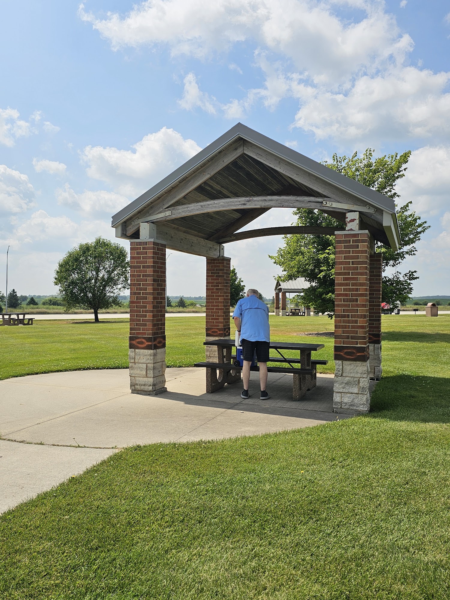 Iowa Rest Stop is a clean and well-maintained facility located accessible from both directions of Interstate 35. The rest area features attractive brick work, "ears of corn" lights, and beautiful tile decor. It offers plenty of amenities, including vending machines, clean restrooms, picnic tables, and small picnic shelters. There are walkways, green spaces, and a large pet walking area, making it suitable for travelers with pets and children. The site includes a playground, travel information, and vending machines for snacks and drinks. Although signage is limited, visitors find it a safe and pleasant place to rest, walk, and relax during their journey.