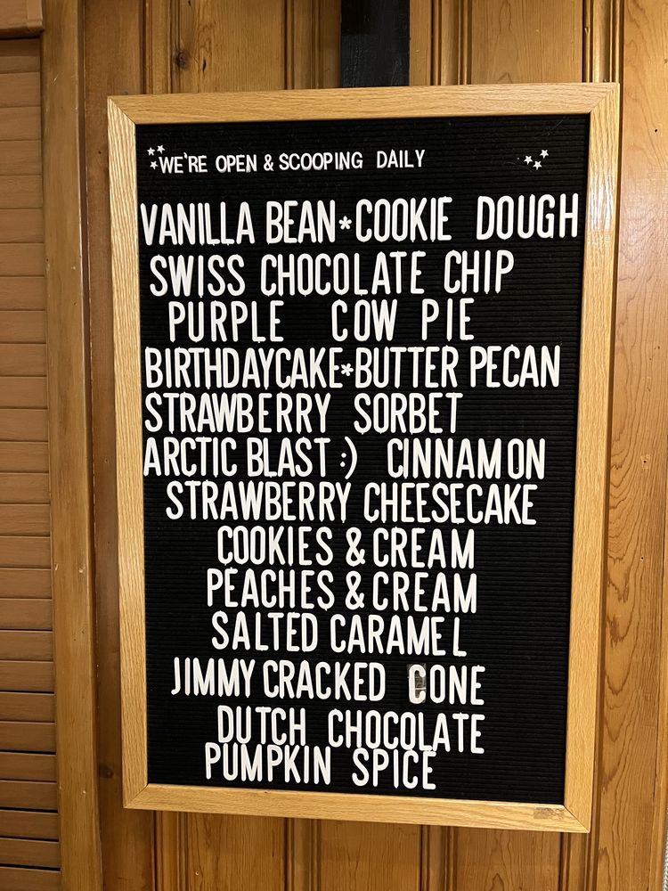 Chocolate Milk, ice cream, granola ,meats and cheeses. YUMMYA must stop place for any day your driving past.They have all the things you need. Coffee icecream, strawberry shortcake icecream, peaches and cream icecream and many many more.3 fruits a day ( in icecream) What more could you ask for. Haha