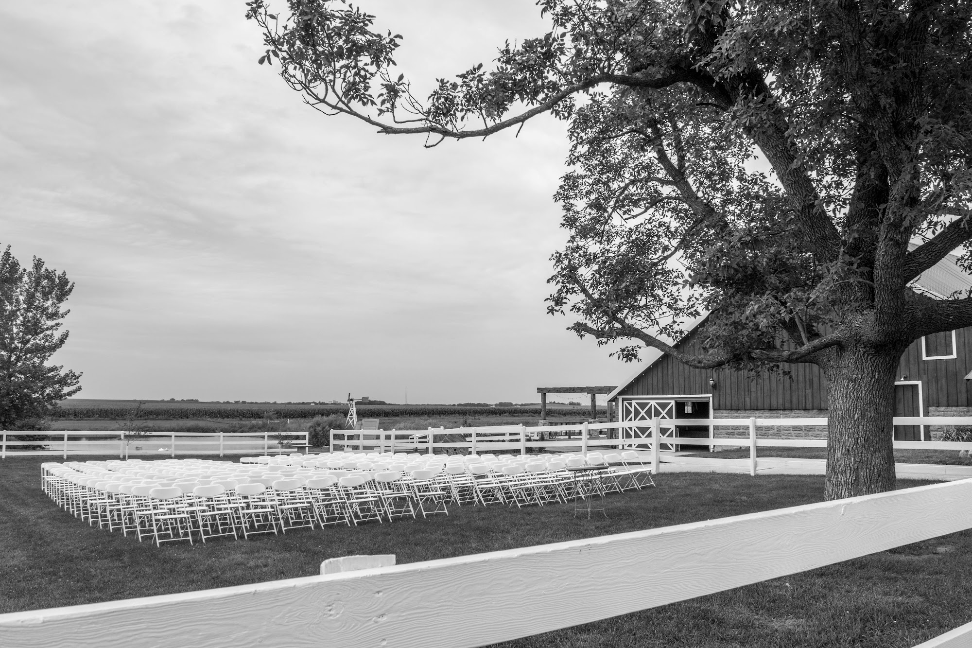 The Rustic Rose Barn is a charming and historic venue located just north of Ames, in the countryside. Built more than one hundred years ago, the barn features rich craftsmanship with hand-hewn pegged beams and field-stone walls crafted on site in the late 1800s. Its rustic charm and elegance make it a perfect backdrop for special events like weddings. The venue offers both indoor and outdoor spaces, including a large indoor ballroom with a beautiful chandelier, string lights, and drapery wrapped around old wood beams, creating a classically elegant yet rustic atmosphere. Outside, guests can enjoy a pond, a horse pasture with resident horses, and a spacious outdoor patio ideal for mingling and socializing. The venue provides amenities such as a bridal suite, a grooms' room with a poker table, and getting-ready spaces that many couples find helpful. The outdoor area is perfect for ceremonies, with scenic spots for photos, especially at sunset by the pond. The grounds are great for photos, with picturesque settings including a pond and horse pasture. The staff is known for being very helpful, professional, and attentive to details, making the planning process smooth and stress-free. Many reviews highlight the helpfulness of the staff, the beautiful decor, and the overall experience. The venue also offers amenities like valet parking and decor borrowing, making it a convenient and memorable choice for weddings and events. Overall, The Rustic Rose Barn is highly recommended for its historic charm, beautiful setting, and dedicated staff who want every event to be perfect.