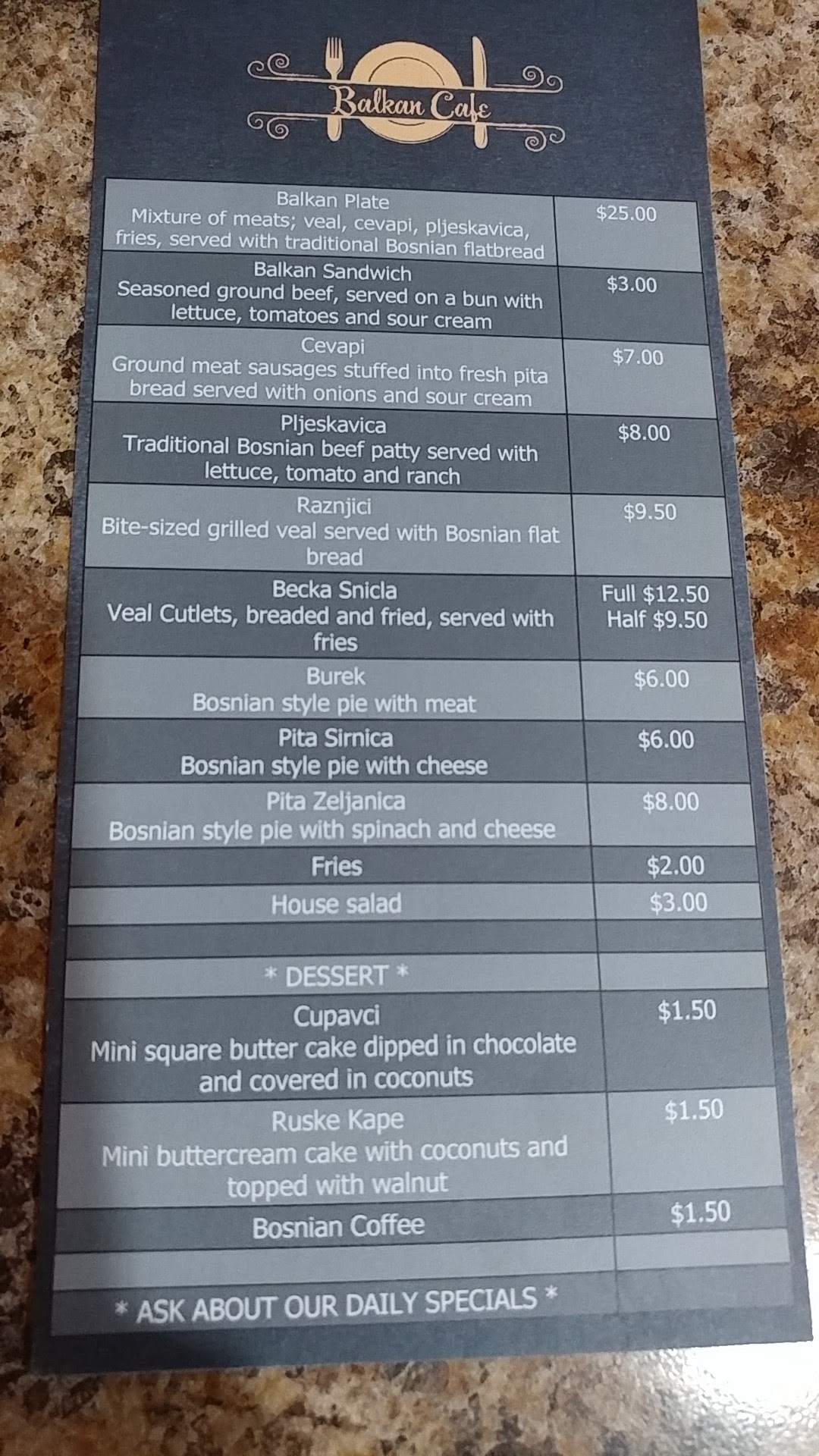 Balkan Cafe & Grocery is a hidden gem in Waterloo, offering an authentic Bosnian food experience. The food is incredible, delicious, and decadent, with fresh items made in the morning like the soft and savory Burek. Popular dishes like cevapi and Grah are also highlights. The bread served is delicious, like pita but slightly fried. Sides like the fries and cabbage salad are excellent. They also serve really good Turkish coffee and have a unique selection of bottled drinks from across Europe. The service is very fast and friendly, with the owner being extremely helpful in explaining the menu. The seating is limited due to the small space, but the vibes give a comforting “back home” type of feeling. The cost is incredibly reasonable. Additionally, the cafe has a grocery store with a decent range of hard-to-find European goods, allowing you to buy what they serve. It is a cute little place that is a pleasant surprise and comes highly recommended. Customers definitely plan to come back.
