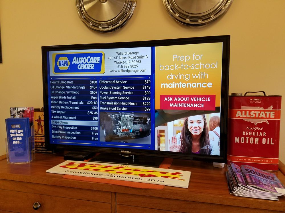 Willard Garage is a family-owned and operated NAPA AutoCare Center serving the Waukee, Iowa community since 2014. Known for their reliable repairs and honest service, they have built a strong reputation for professionalism and trustworthiness. Their ASE certified technicians use the latest technology to handle a variety of automotive needs, including diagnostics, engine repairs, suspension work, brake checks, transmission flushes, and oil changes. Customers appreciate the clear communication, thorough inspections, and attention to detail that ensure problems are properly diagnosed and fixed. The team is friendly, professional, and dedicated to providing high-quality service. Many customers have been returning for over 15 years, highlighting the consistent positive experiences and trustworthy care they receive. Willard Garage also offers a loaner car service, making the process more convenient for customers. As a NAPA AutoCare Center, all repairs are backed by a 36-month/36,000-mile warranty, giving peace of mind. Whether dealing with simple maintenance or more complex repairs, customers feel confident that their vehicles are in good hands. With a focus on integrity, professionalism, and customer satisfaction, Willard Garage continues to serve the local community and earn the trust of drivers in the area.