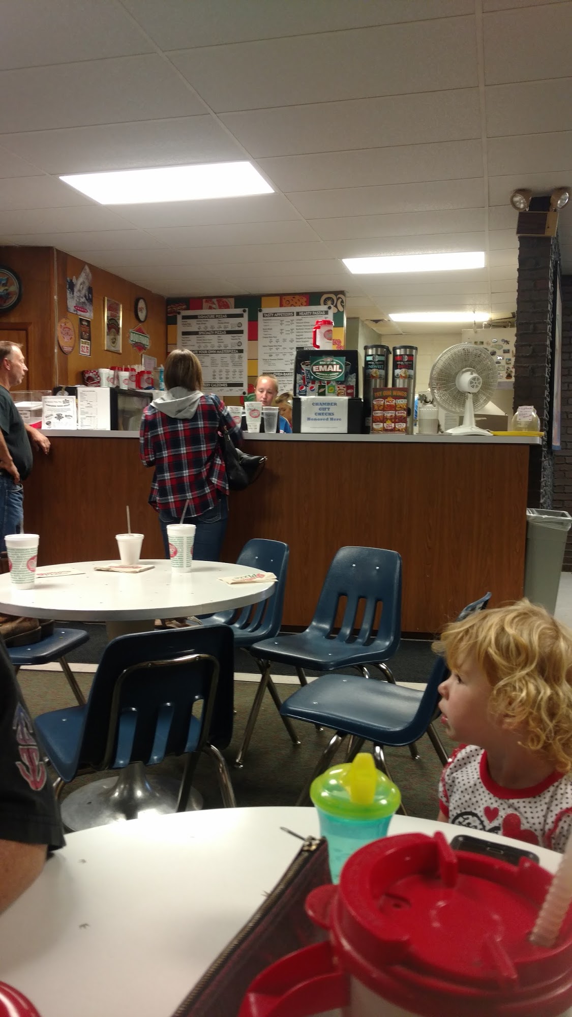 Great staff, friendly customers. Lots of kids, great Gambino pizzas. Check out the pizza cutting board at the counter. It was worth the trip to stop in eat and enjoy.