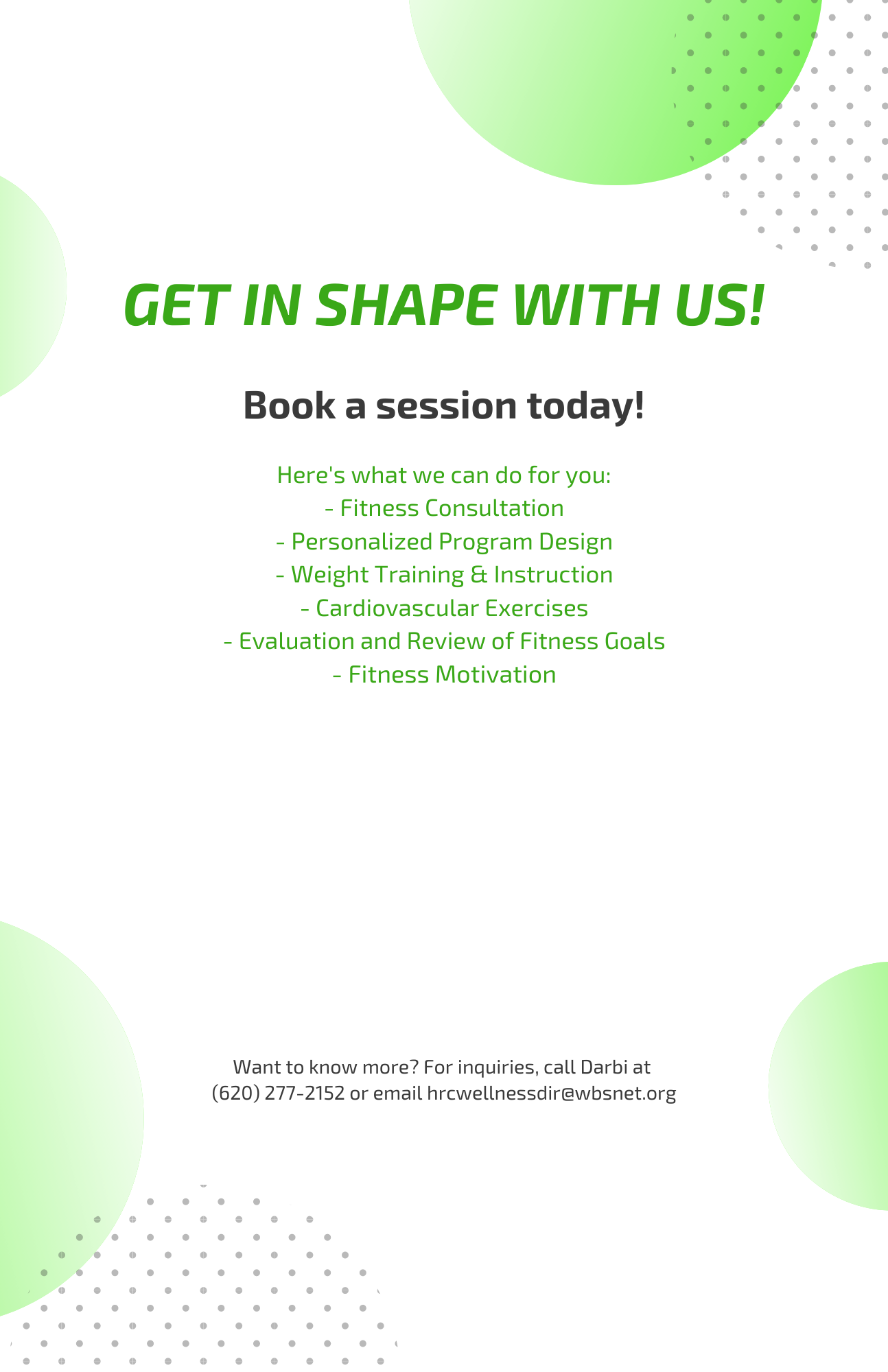 Clean and nice equipment. Wellness Center Supervisor Darby is helpful!