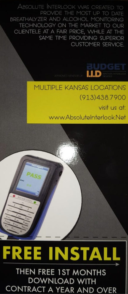 Absolute Interlock provides Ignition Interlock devices, calibration, Installation, removals and 24hr emergency service and support for anyone who recieves a DUI in Johnson and Wyandotte Counties. Overland Park, Lenexa, Olathe, Gardner, Kansas City, Leawood, Prairie Village, Shawnee, Roeland Park and more in Kansas Lowest total cost with the absolute best and friendliest service around. Please check the reviews. We do not charge to calibrate the device. Saving you anywhere from $25 to $45 a month. We don't charge to send reports to the state or probation officer. We will not charge you if you get just one violation. Come to a place where you will actually be respected and treated like family.
