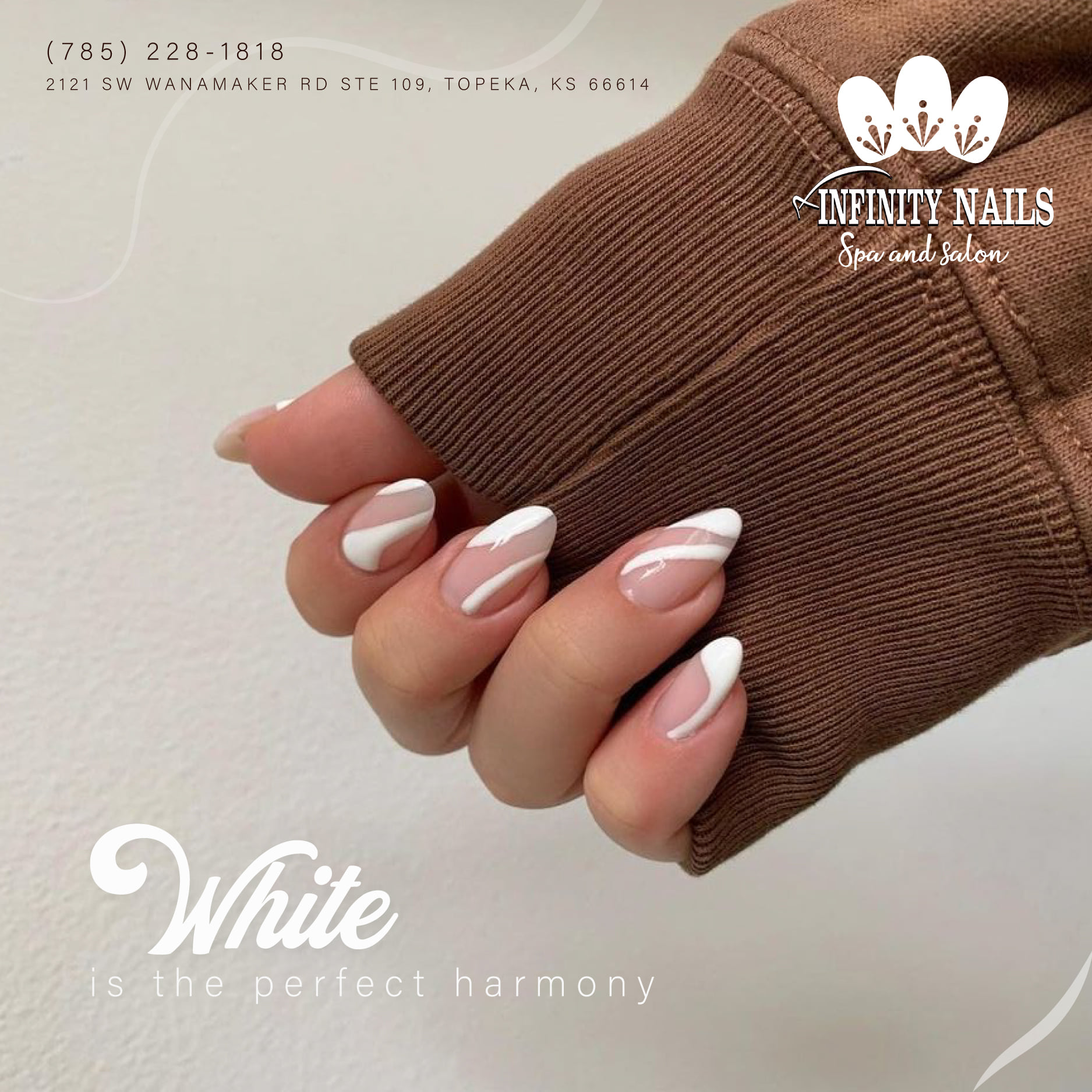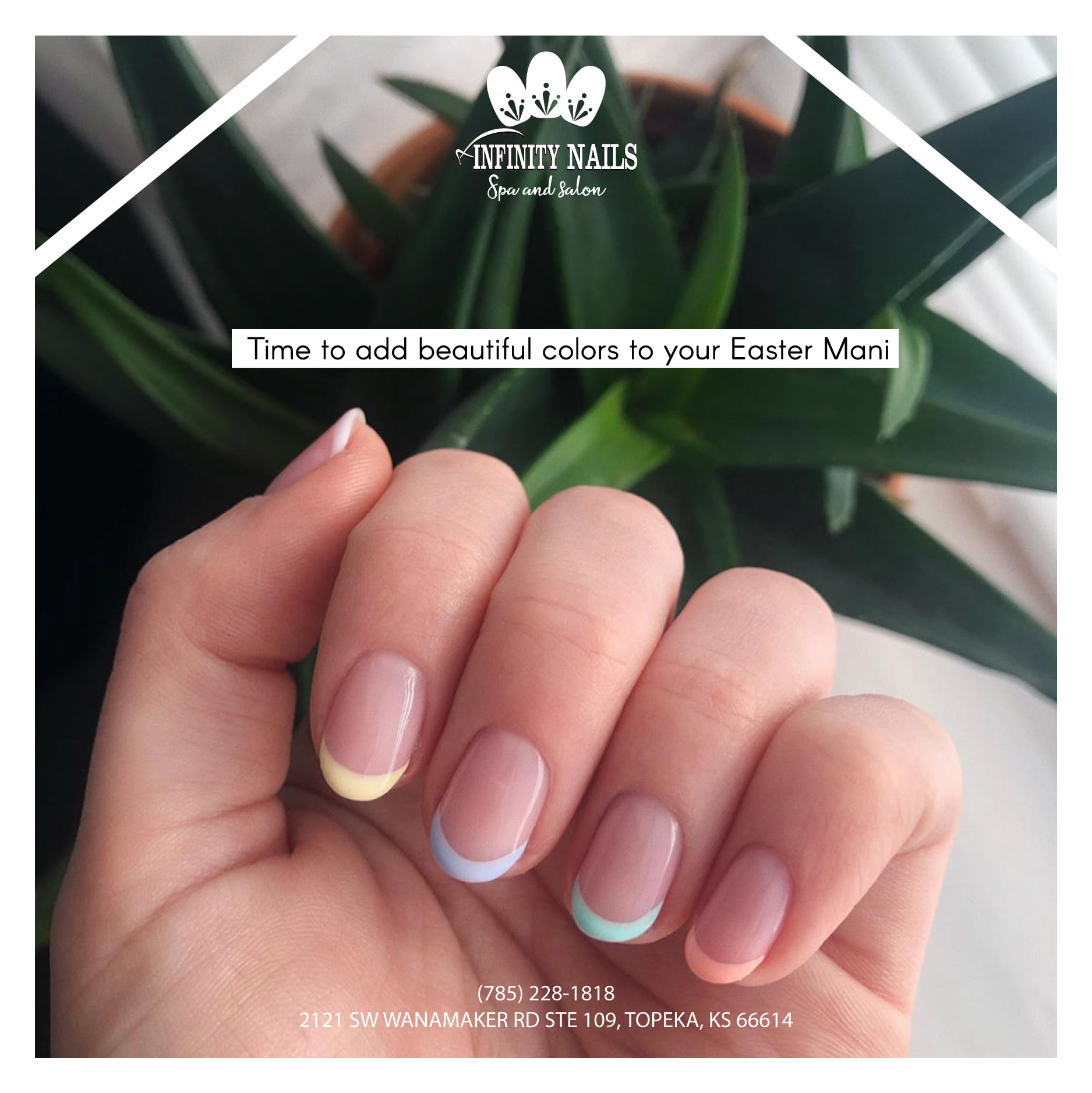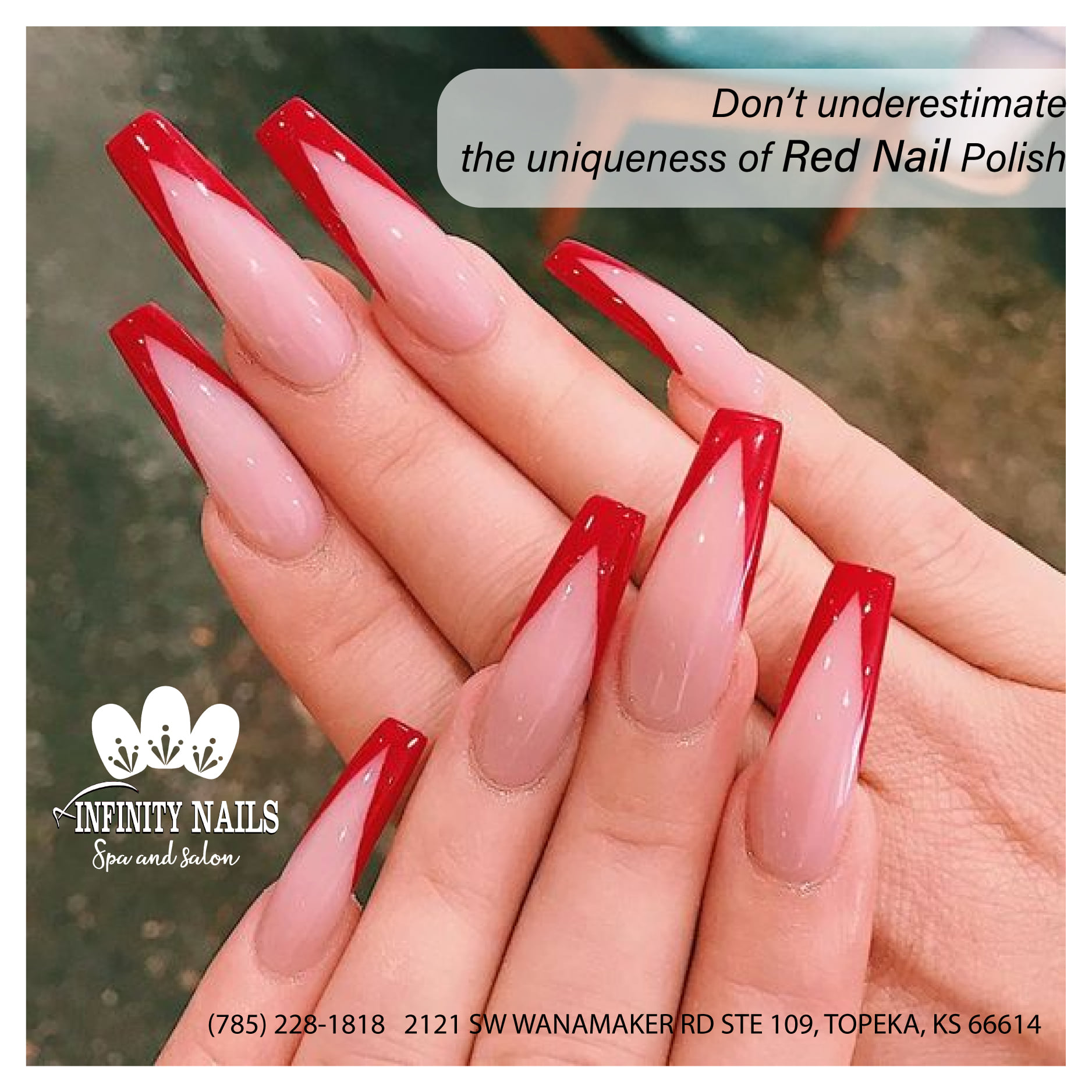Located in Topeka, KS 66614, Infinity Nails Spa and Salon was found with the mission to honor your beauty and give you a great experience with the best manicure and pedicure in town. Starting with the passion for nail art, more than anyone, we understand your needs are to be pampered with the best nail treatments in a peaceful and cozy space. We want to be a destination where you could relax and enjoy the tranquil time from a busy working day. Whenever visiting our salon in Topeka, KS 66614, you can become a spotlight stealer among the crowd with our unique nail designs. We own a large collection of all nail styles: from simple to fancy, from monochrome to brilliant. #nailsalon66614 #nailsalonintopeka #nailsalonnearmeintopeka