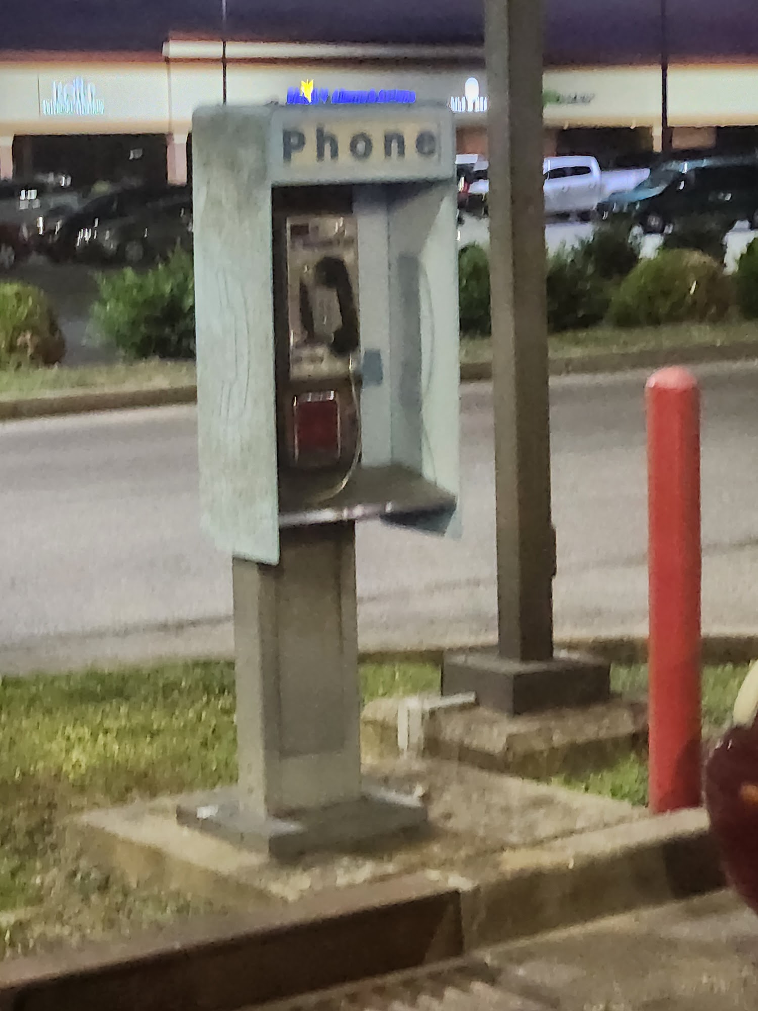 Great section of businesses, easy parking, and great lighting. Including a pay phone, wow!