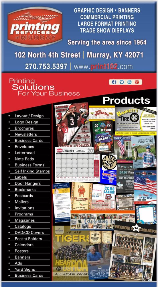 Printing Services of Murray, located in Murray, KY, has been serving the area since 1964. They specialize in business signage and printing services, covering Hopkinsville, Cadiz, Mayfield, Paducah, Benton, and nearby communities. Customers appreciate their fast, reliable, and professional service. The team is passionate about quality and creativity, with a graphic department known for coming up with great ideas. Many reviews highlight how easy it is to work with them, mentioning their helpfulness and good customer service. The online forms are simple to fill out, and the staff often anticipates customer needs, providing materials and ideas quickly. They are highly recommended for various printing jobs, including posters, invitations, signs, and stickers, often at a better price and faster turnaround than online options. Overall, Printing Services of Murray is recognized for their skilled work, friendly service, and ability to meet different printing needs efficiently.