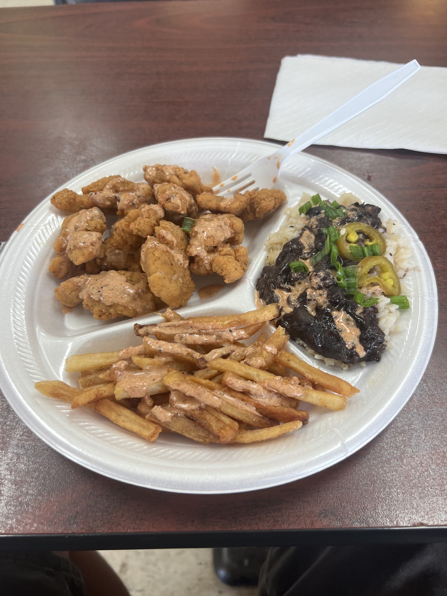 Cajun chicken Cajun fries and rice and beans for the win was very good!!