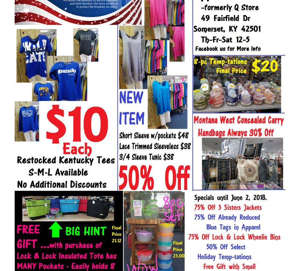 Applex Outlet is a store in Somerset, KY that fans of QVC will absolutely love. They make you feel so welcome from the moment you step in the door. The store has a great new remodel and offers a large selection of items including Temp-tations, Lock & Lock, purses, quilts, fashion jewelry, and clothing from QVC and Amazon in sizes XXS to 3X. They also have a large selection of Poo-Pourri. The ladies are fun to visit with and know what you want. They are open Thursday through Saturday with 30-90% off everything everyday.