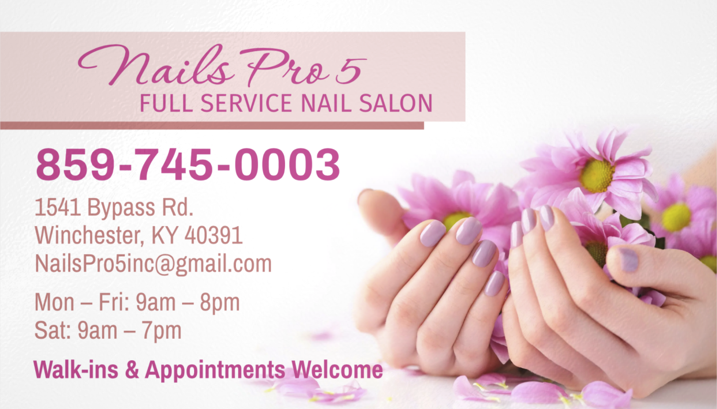 Nails Pro 5 in Winchester offers professional and welcoming service, with easy appointment booking and reasonable prices. The staff is courteous and kind, providing excellent nail care. Customers generally enjoy their experience and appreciate the skilled technicians, such as those whose names may start with the letter "C". They offer acrylic nails with intricate designs, leaving customers satisfied and eager to return. The salon has received positive reviews from customers who praise the friendly atmosphere and skilled technicians. Customers have highlighted the exceptional service provided by technicians like Kimmie and Tommy, who take the time to listen to their requests and deliver outstanding results. The salon has also been commended for its thoughtfulness in accommodating the needs of younger clients. While there have been a few isolated issues in the past, the salon has demonstrated a commitment to addressing customer concerns and ensuring a positive experience. The owner or manager has been praised for their responsiveness and efforts to make things right. Overall, Nails Pro 5 is a well-regarded nail salon that offers professional and personalized service, leaving customers satisfied and eager to return.