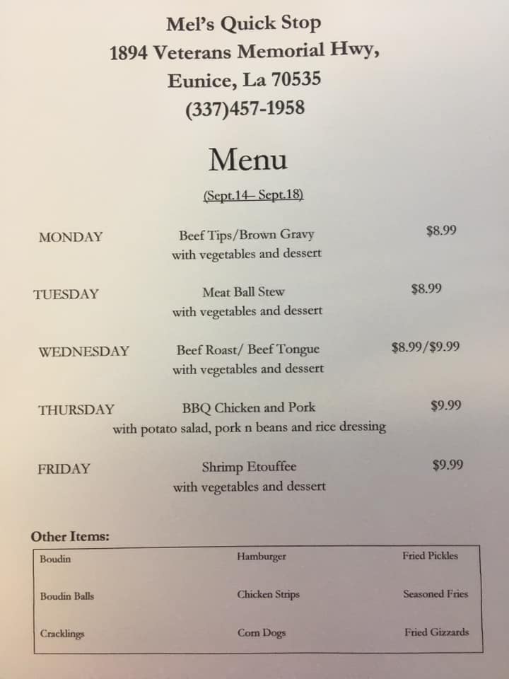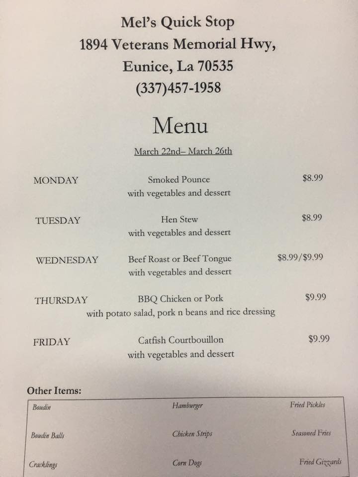 Mel's is NOT a restaurant. This place is a convenient store that offers fresh meat, boudin, cracklins, groceries, gasoline, and meals to go.