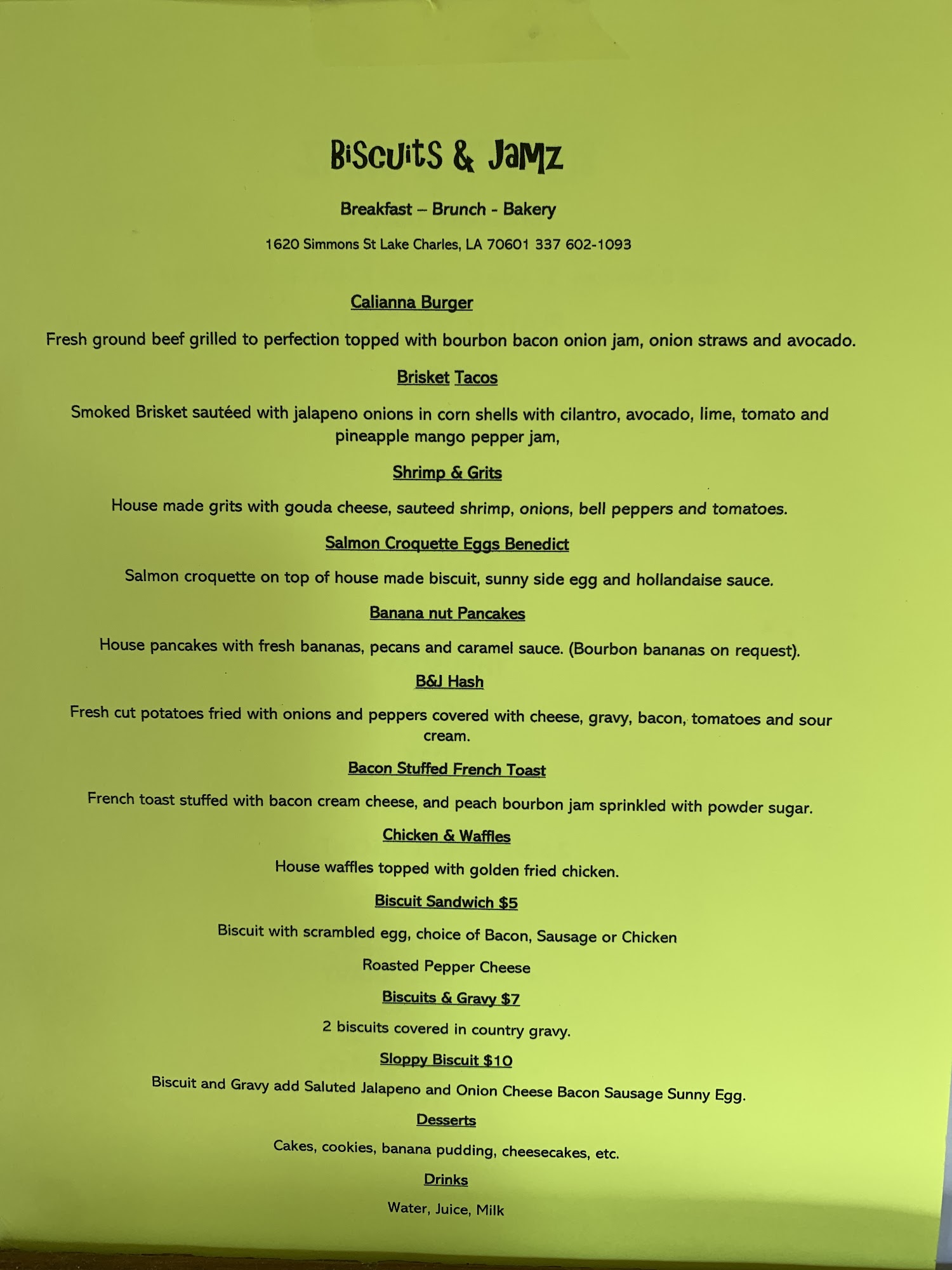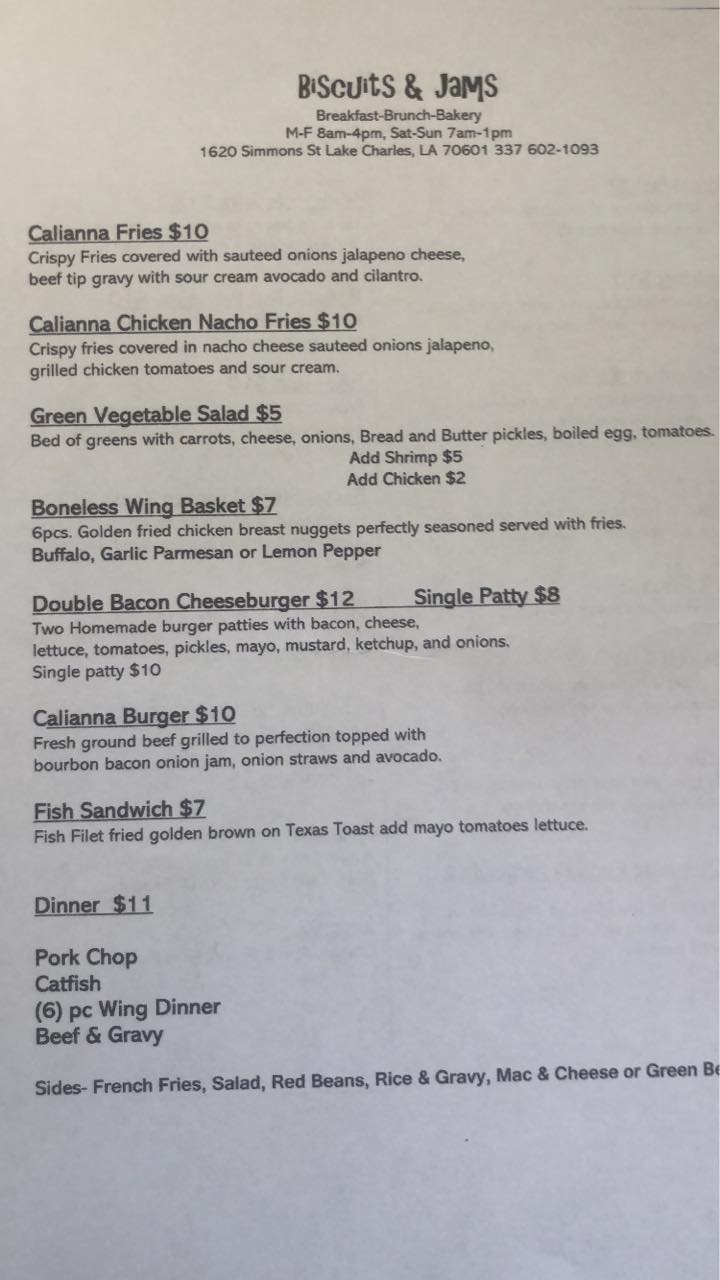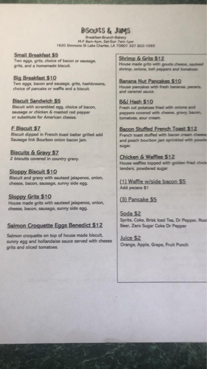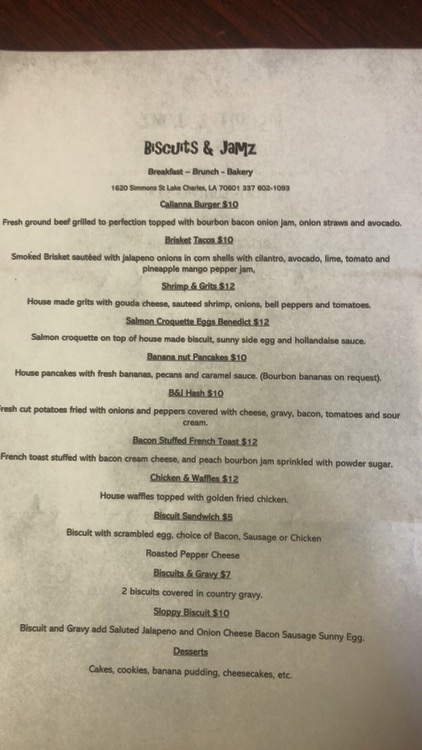 Biscuits & Jamz is a beloved local restaurant in Lake Charles known for its delicious, fresh food and warm, family-oriented atmosphere. Many visitors describe it as a hidden gem that feels like eating at big momma’s house, thanks to Southern hospitality and friendly staff. The menu is unique and full of flavors you won't find elsewhere, with a wide variety of dishes including shrimp and grits, fried catfish, étouffée, waffles, omelets, and biscuits. The food consistently impresses guests, often exceeding expectations and rivaling well-known breakfast spots from Houston to Coushatta. Customers especially enjoy the tender grits, buttery biscuits, and flavorful entrees like chipotle chicken and salmon croquettes. The restaurant plays Christian music, creating a welcoming, peaceful vibe that keeps visitors returning. Despite limited parking and wheelchair accessibility challenges, the inside space is accommodating and easy to maneuver. Overall, Biscuits & Jamz is celebrated for its tasty, hearty meals, friendly service, and cozy atmosphere, making it a favorite brunch spot for families and friends looking for a good meal in a warm environment.