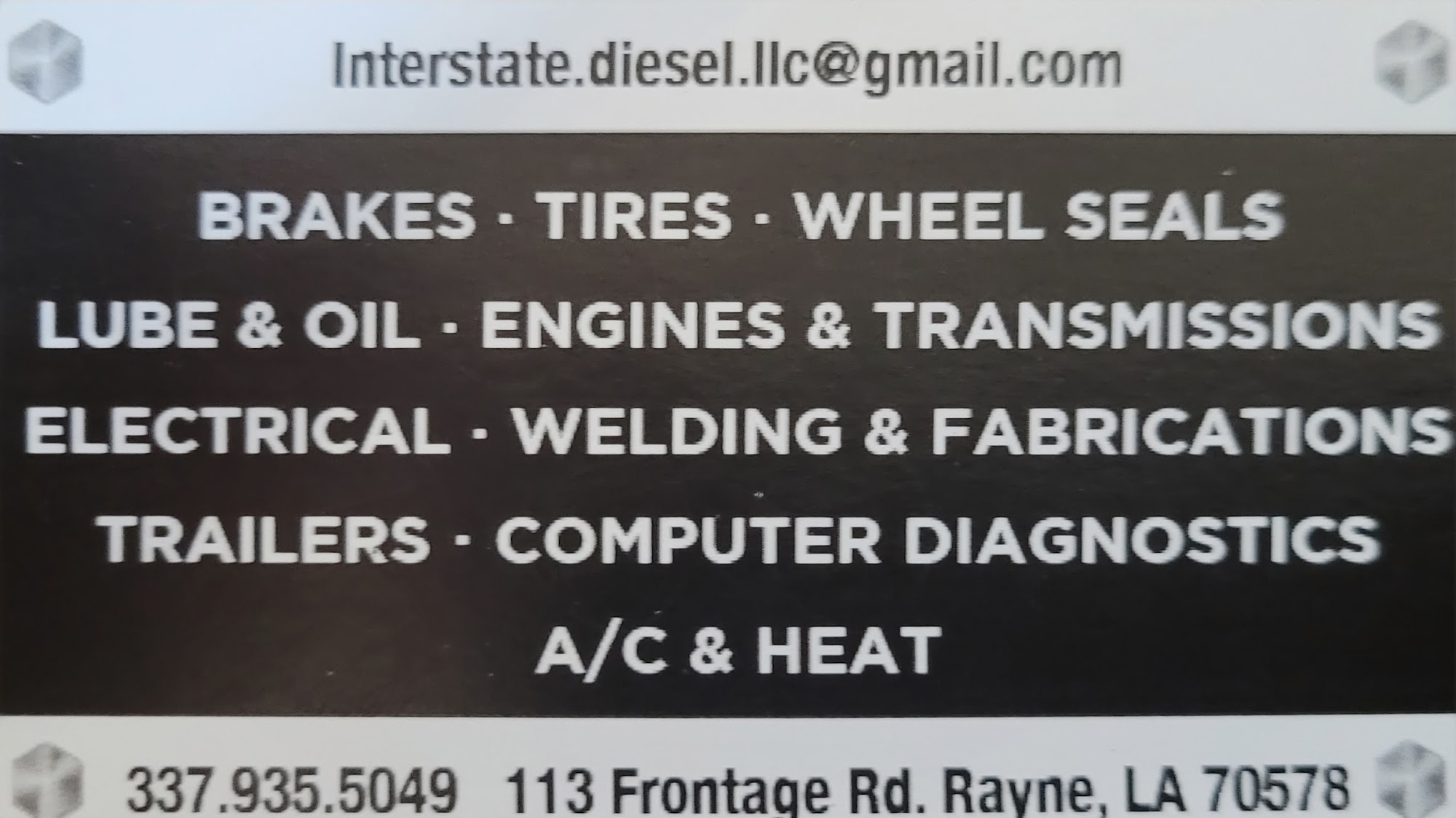 Interstate Diesel, LLC is a family-owned diesel mechanic shop located in Duson, Louisiana, right behind Rascal's Truck Stop and conveniently off I-10. Open Monday through Friday from 8 AM to 5 PM, the shop offers a range of services including brakes, tires, engines, transmissions, welding, trailer repair, diagnostics, and maintenance. They also provide 24-hour roadside assistance to ensure customers are taken care of, no matter the situation. With six years of experience, the team at Interstate Diesel is recognized for their thorough and knowledgeable service. Customers consistently praise the mechanics for their hard work and dedication. Many have reported excellent experiences, highlighting the shop’s ability to diagnose issues effectively and provide quick repairs. The staff is described as friendly, down-to-earth, and committed to getting vehicles back on the road efficiently. Interstate Diesel has become a trusted choice for both local and traveling customers, with numerous reviews recommending the shop for its reliability and excellent customer service. Whether needing routine maintenance or emergency repairs, customers appreciate the quality care they receive at this shop.