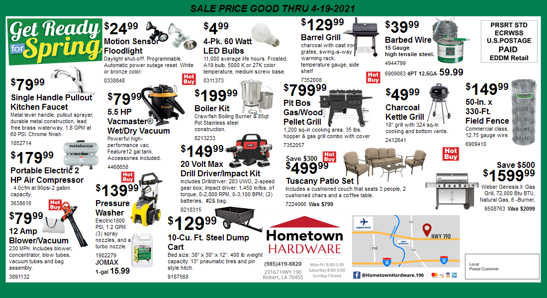 Hardware, Plumbing, Electrical, Tools, Power Tools, Lumber, Building Materials, Culverts, Steps, Feed, Seed, Concrete Mix, Key Cutting, Hunting Supplies, Fishing Supplies, Mobile Home Parts, Auto Parts, Outdoor cooking, Barbeque Grills, Barbeque Supplies, Agriculture Supplies, Boots, Animal Care Products, Camping Supplies, Paint, Paint Sundries, Pipe, Toilet Supplies, Plywood, Sheetrock, Mobile Home Power Pole, Utility Pole,