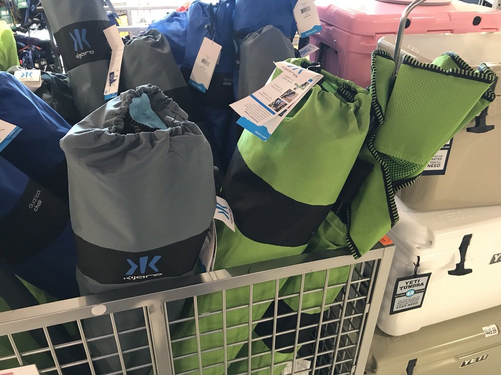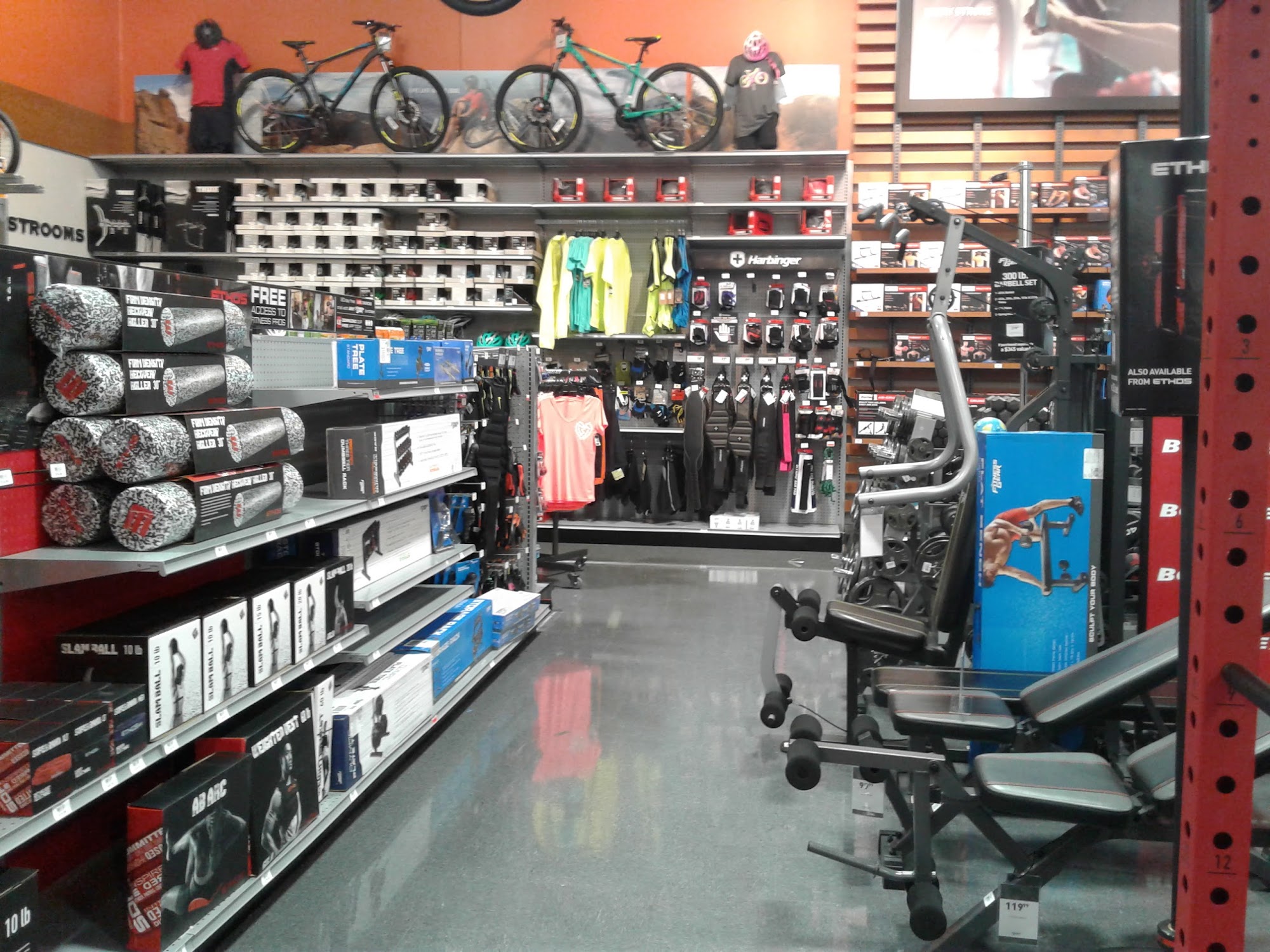 Sells tennis racquets! Spacious retail store with many sports and workout equipments and goods.