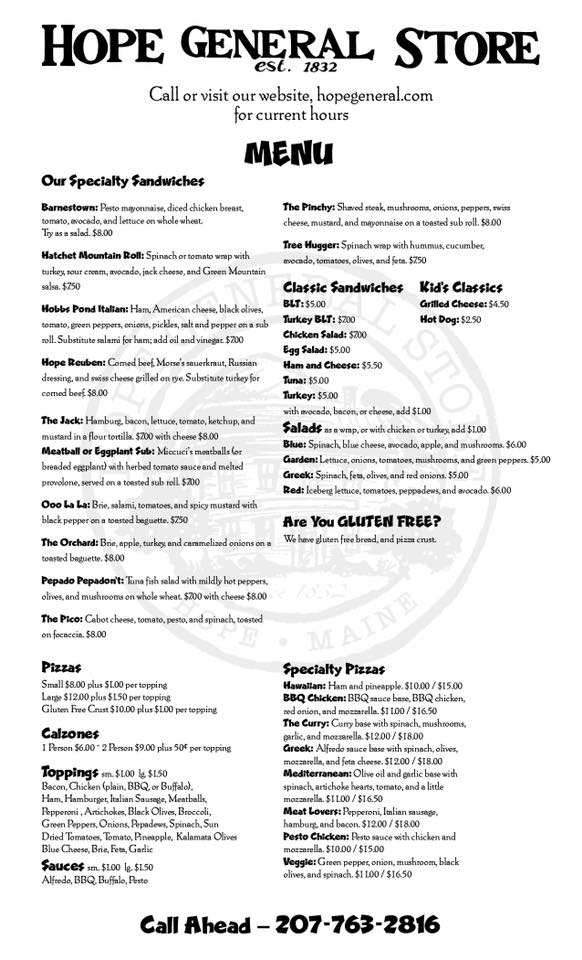 Hope General Store is a cool little general store with a sandwich shop and pizza. It offers a great menu with excellent pizza and delicious sandwiches, including a Reuben. The store has draft beer, kombucha, and a modest price. It is very friendly with a smiling staff. The place is reliable and has a great sitting area to chat with locals or the friendly staff. It provides clean bathrooms and is a great place to get advice for the Maine experience away from tourist traps.