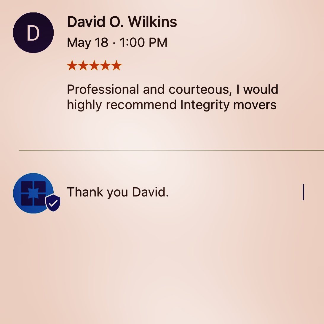 Could not have asked for more. Polite, punctual, communicative, friendly--they did great. They even came in under the estimate! I will recommend Integrity to any friends I know who are moving.