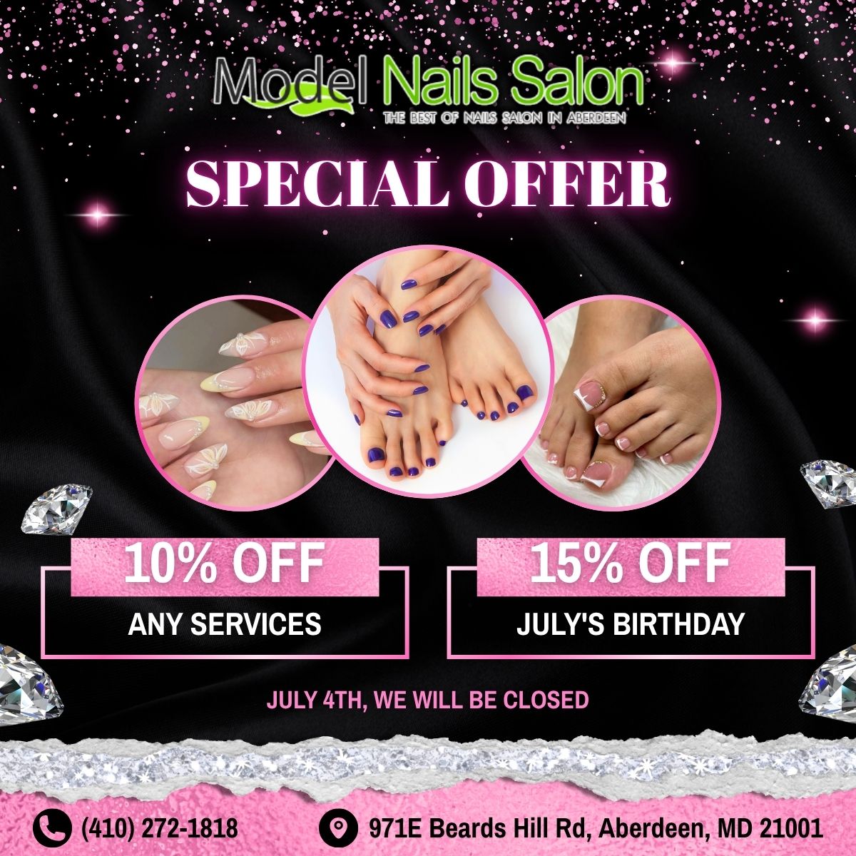 Located at a beautiful place in Aberdeen, Maryland 21001, Model Nails Salon offers you the ultimate in pampering and boosting your natural beauty with our whole-hearted, creative & professional staff. Our salon takes pride in providing our valued customers all good services and top-high quality products as well as materials. You can find all nail-related services, from Manicure, Pedicure to Artificial Nails. At Model Nails Salon, a wide choice is provided to customers, so you can use any services that you like. All of our services are at decent prices, so there is no hesitation when you use one or even more services at our salon.