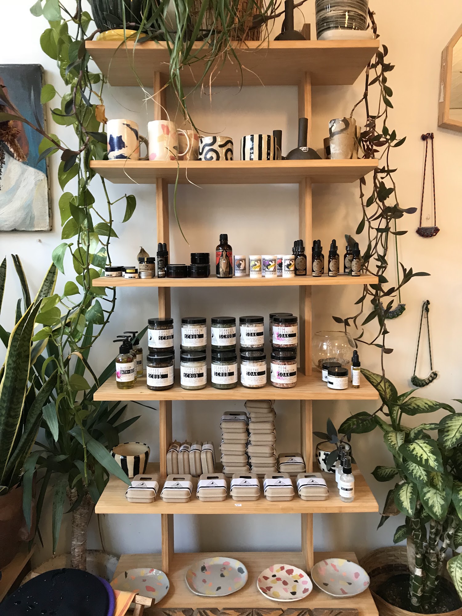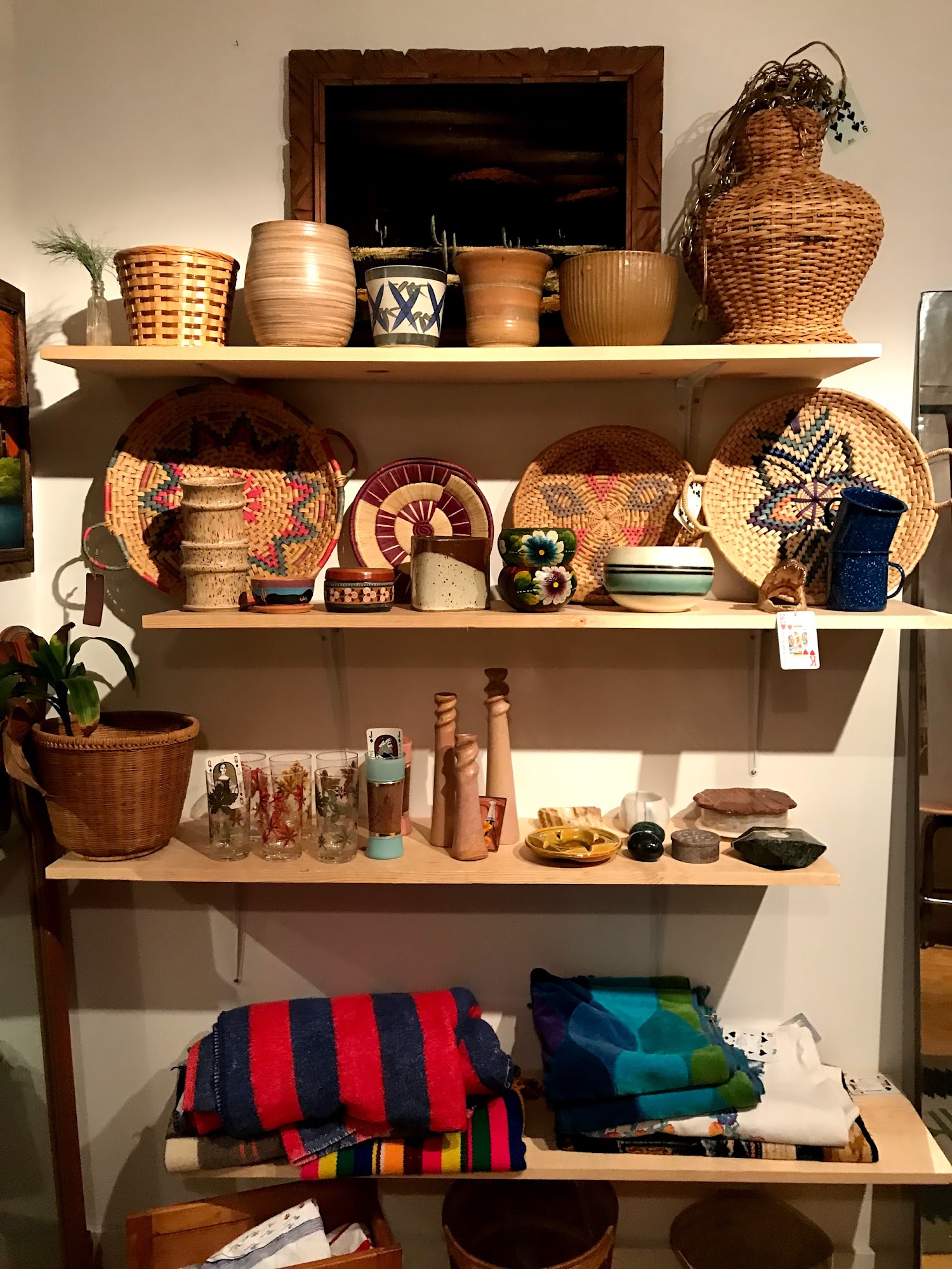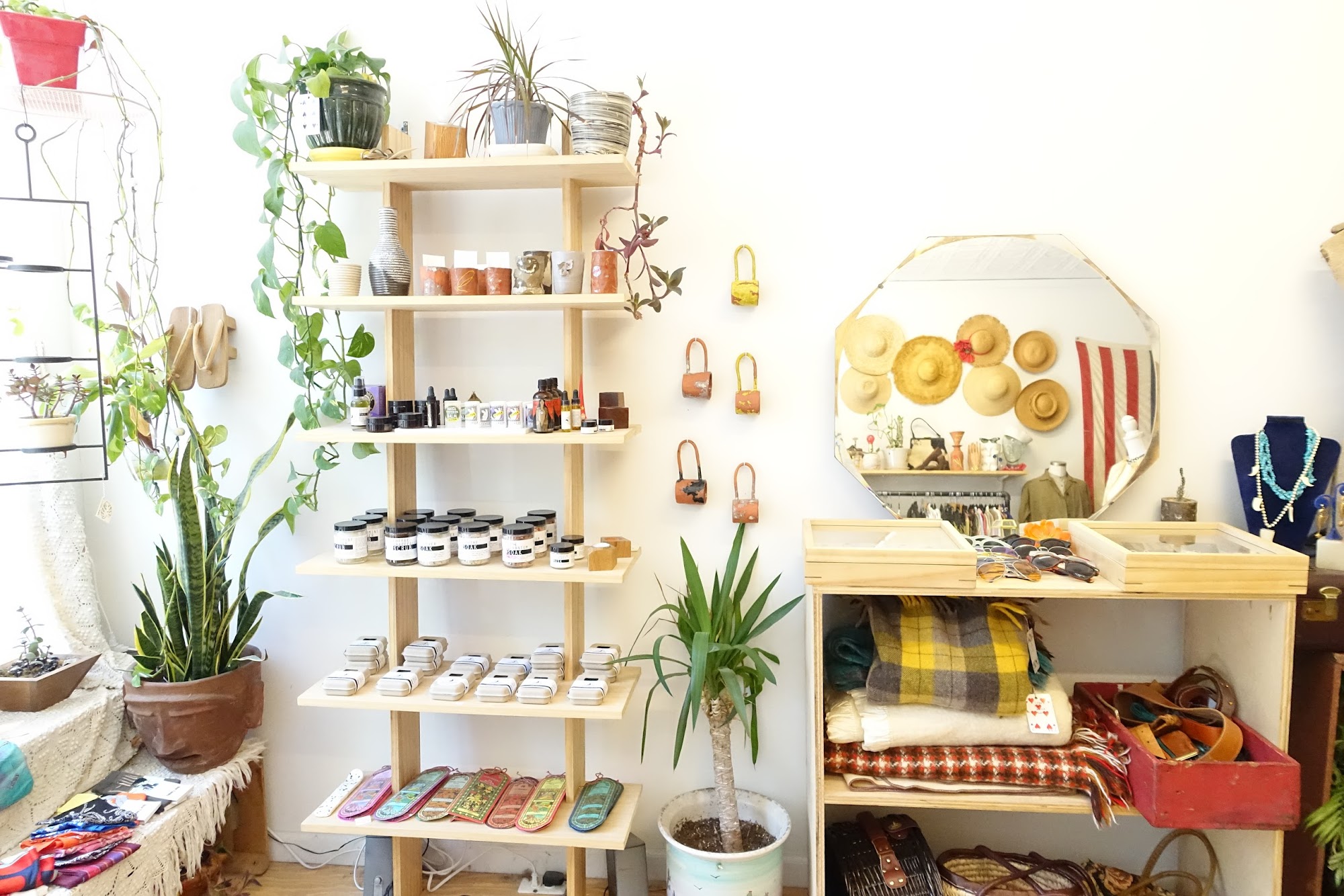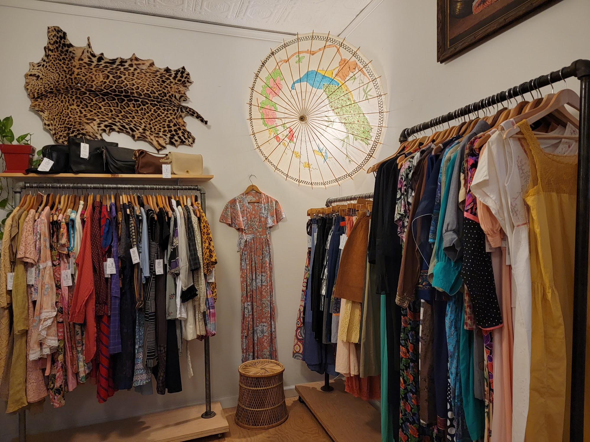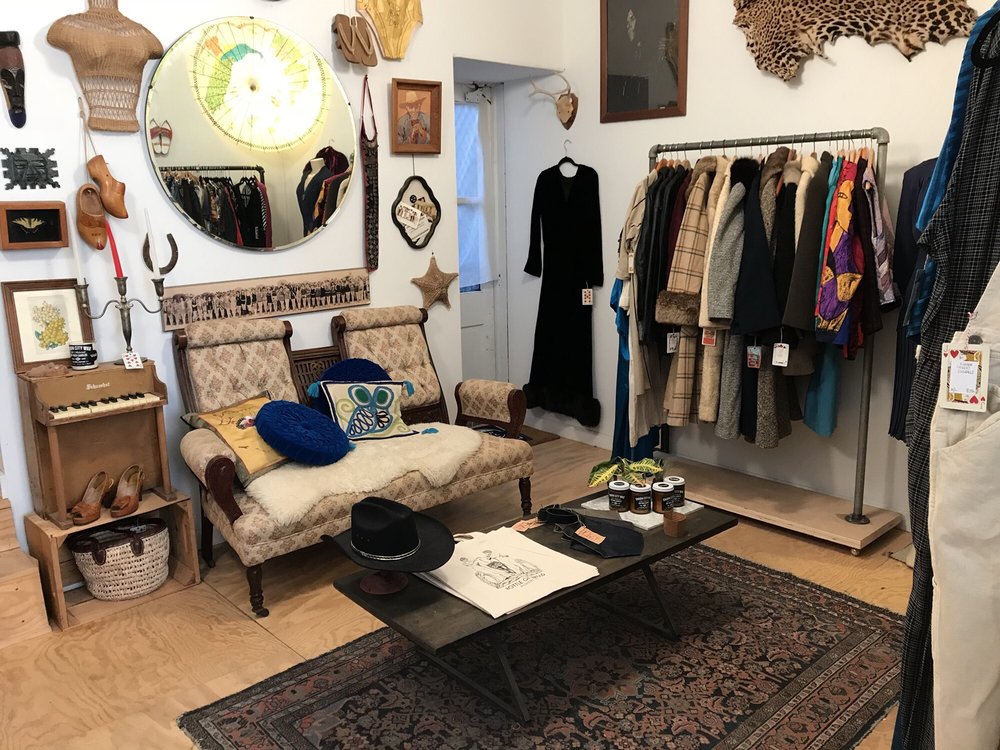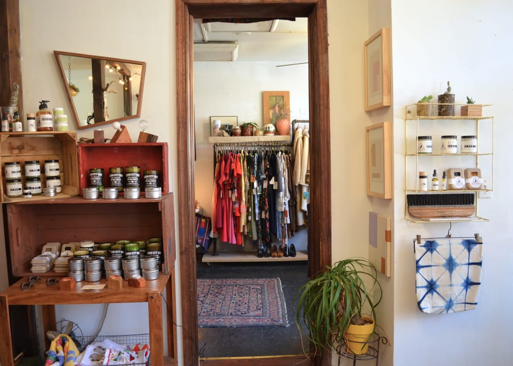 Bottle of Bread is an absolutely incredible and charming vintage shop. It is a neat little store with a very well-curated selection, offering a good mixture of true vintage and recent vintage clothing. The shop carries many styles, sizes, and eras, including a good selection of mens clothing that isn't just sports attire. Shoppers can find hand crafted jewelry and accessories alongside the apparel. While the art generally isn't for sale, the clothing prices are very reasonable and often feel like a steal for the near-perfect condition of the pieces, though they are a bit higher than a standard thrift store due to the careful curation. The vibe in the store is comforting and the customer service is great, contributing to an overall good shopping experience. There are fitting rooms available to try on clothes. The shop is definitely not large, but visitors are consistently surprised by the number of pieces they want to try on. It is the perfect place to wander into when in the area to see what’s new, and many customers plan to keep it in their rotation for finding great vintage pieces.