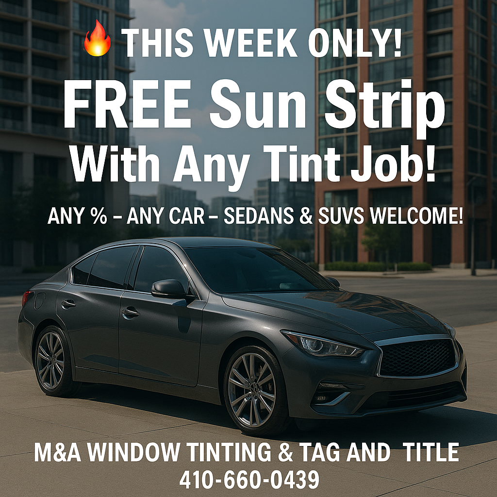 M&A Window Tinting and Maryland Tag and Title, located at 6127 Reisterstown Rd., Baltimore, MD 21215, is a comprehensive automotive service provider specializing in premium window tinting and vehicle registration services. Window Tinting Services: M&A offers professional window tinting with competitive pricing: • Small Two-Door Cars: Starting at $80. • Small Four-Door Cars: Starting at $100. These rates are notably affordable compared to the average window tinting costs in Maryland, which range from $250 to $350 for a four-door sedan.  Maryland Tag and Title Services: In addition to window tinting, M&A provides Maryland MVA tag and title services, streamlining vehicle registration and title processes for customers.