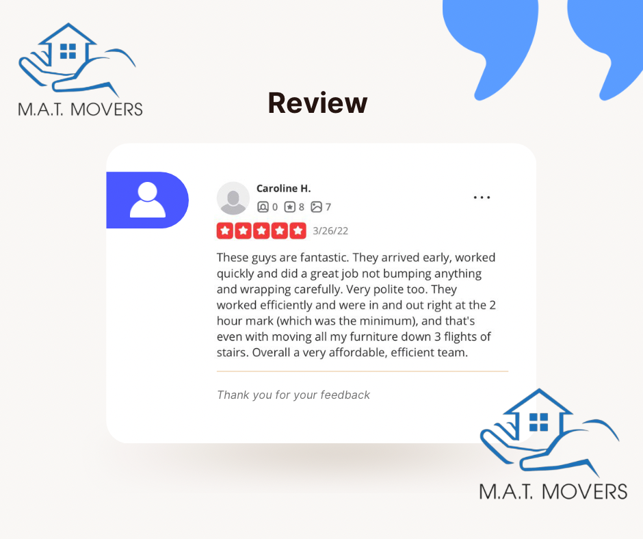 M.A.T. Movers is a highly regarded moving company in the Washington D.C. area since 2016, known for providing affordable and reliable moving services for homes and offices. Customers appreciate the stress-free experience offered by the team, highlighting their professionalism, punctuality, and courteous nature. Whether it is a local or long-distance move, M.A.T. Movers stands out for its hard-working staff who go above and beyond to ensure customer satisfaction. Many reviews commend the team's efficiency and skill in handling challenging tasks, such as wrapping items carefully and navigating difficult spaces. Clients have noted that there are no hidden fees or unexpected changes in pricing, making the service transparent and trustworthy. M.A.T. Movers has received numerous referrals from satisfied customers, who praise the overall experience and express their intention to use the service again in the future. Overall, M.A.T. Movers is recognized for its top-notch service, making moving a smooth and pleasant process.
