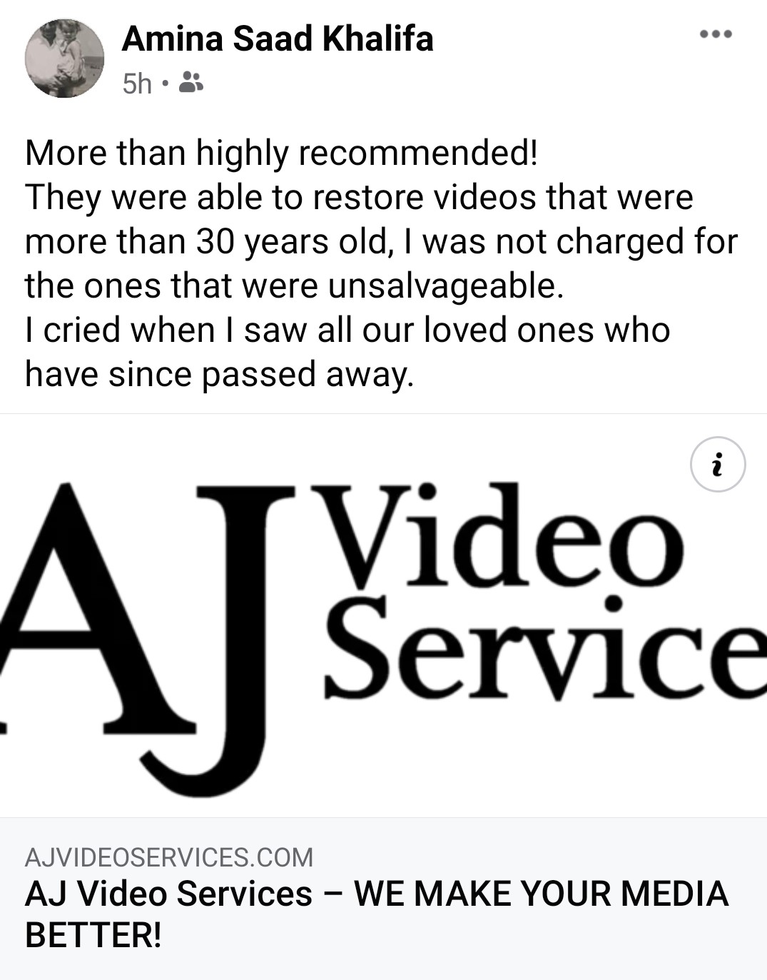 Jim at AJ Video services is perhaps one of the nicest people I've met! He went above and beyond to restore a scratched DVD for me. I couldn't be happier with the result! Highly recommend.