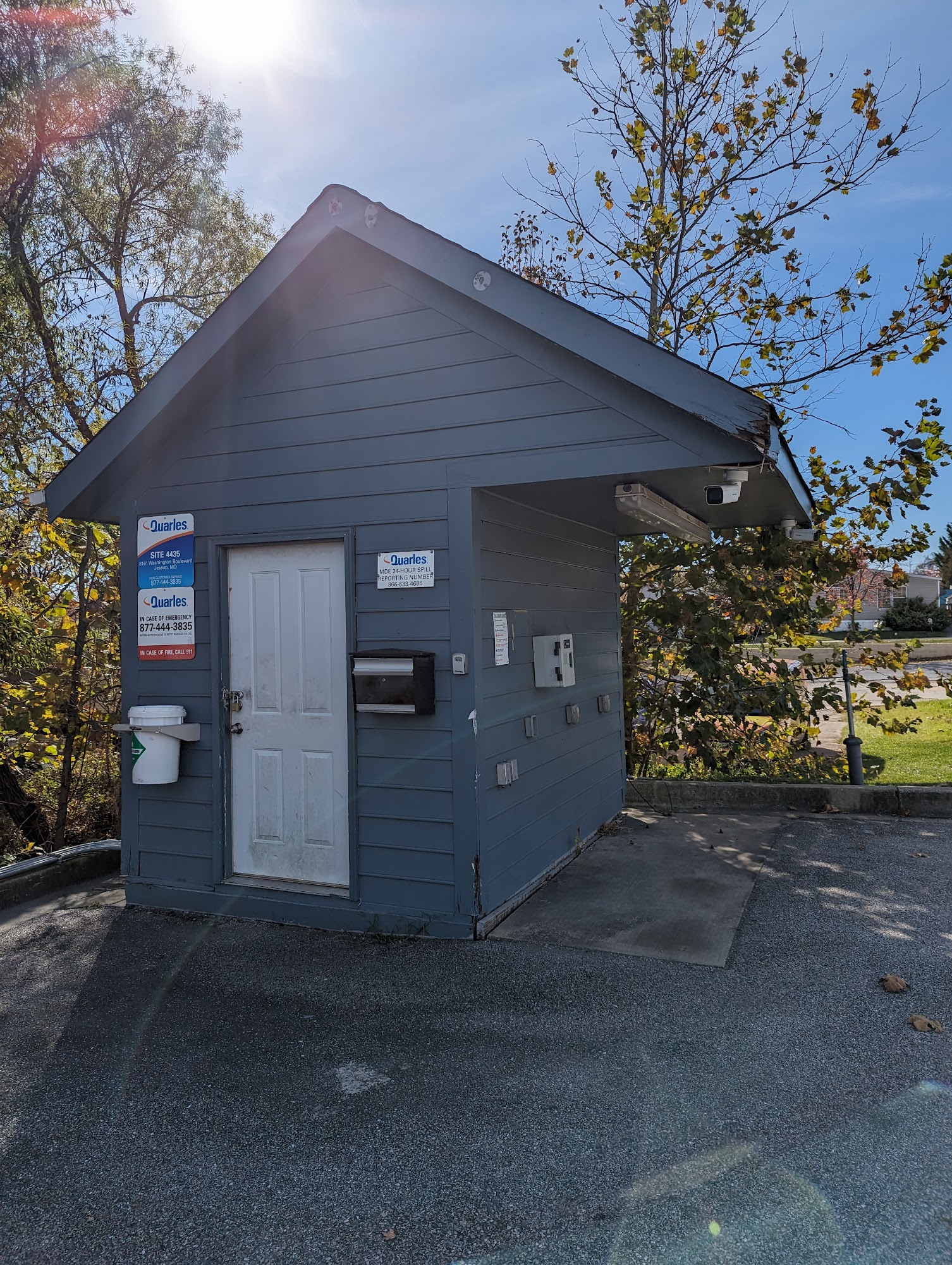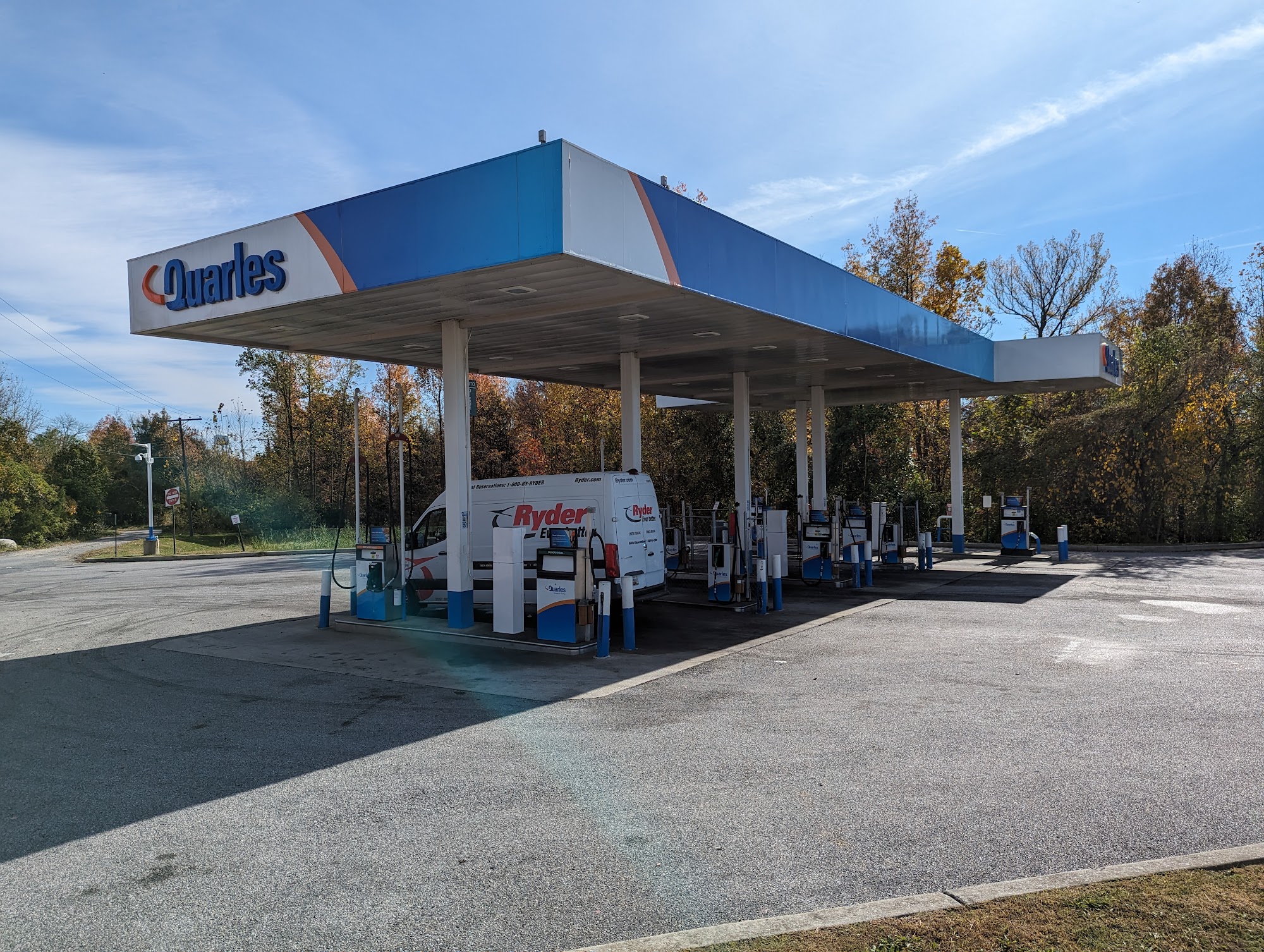 "Quarles is Quality." The pumps are outdated. This is an unmanned fuel station.