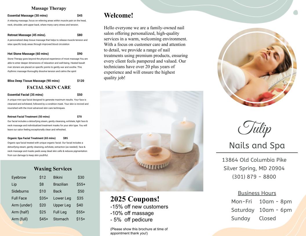 Tulip Nails, a family-owned nail salon, offers a warm and welcoming environment with personalized, high-quality services. Under new ownership since 2025, the salon prioritizes customer care and attention to detail. Technicians possess over 20 years of experience, ensuring a high-quality job. Clients describe the staff as amazing, kind-hearted, beautiful, kind, and patient. The establishment is considered beautiful, and the work is intentional. Tulip Nails provides a relaxing experience, with features like a hot pack for neck comfort. Clients express their love for the salon and plan to return, finding it to be their go-to spot.