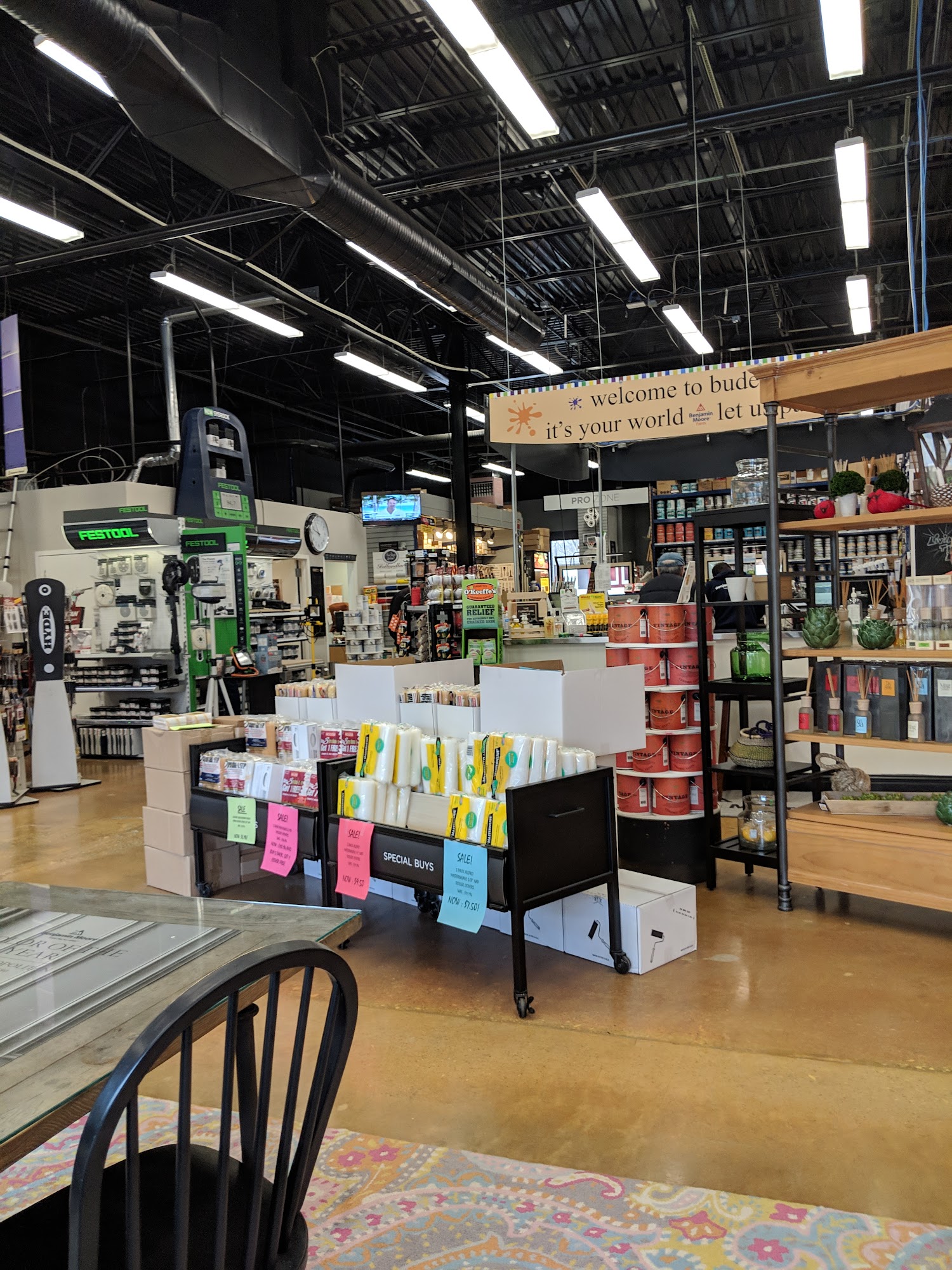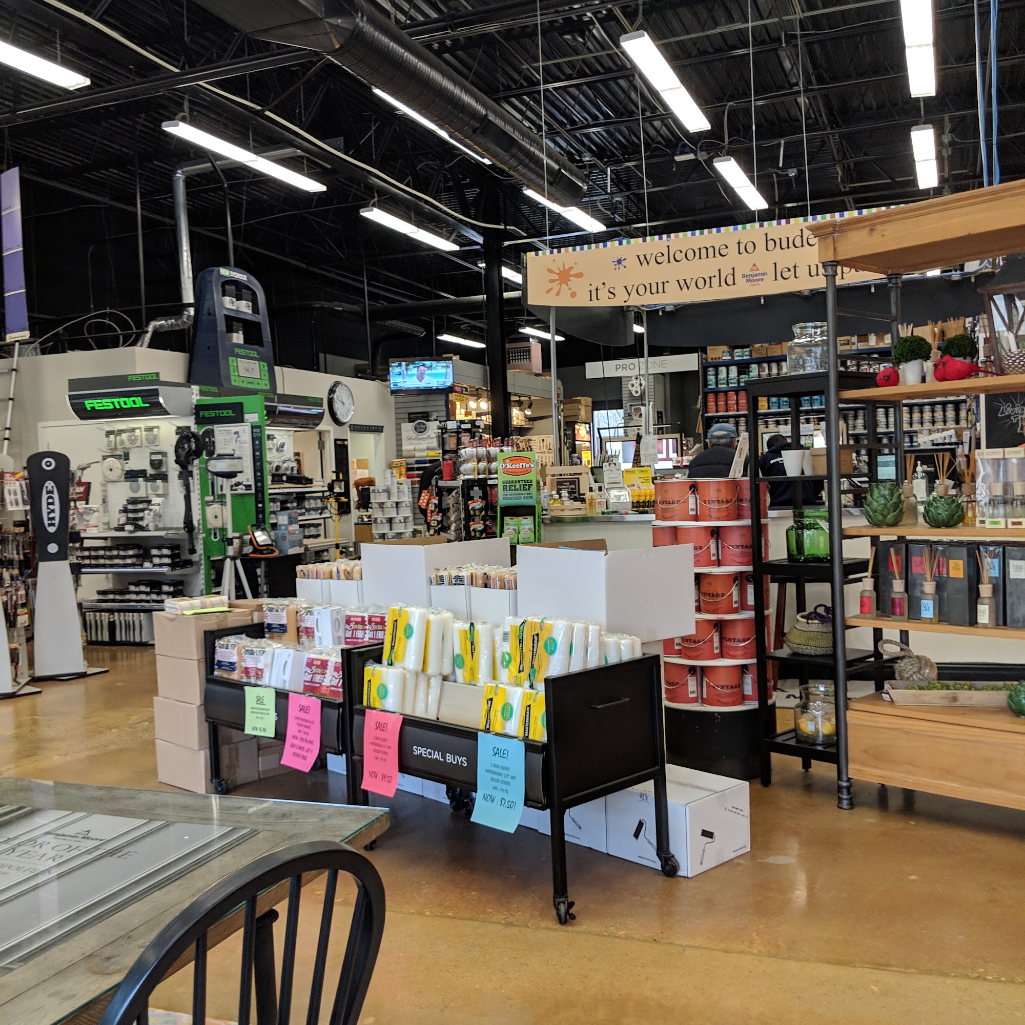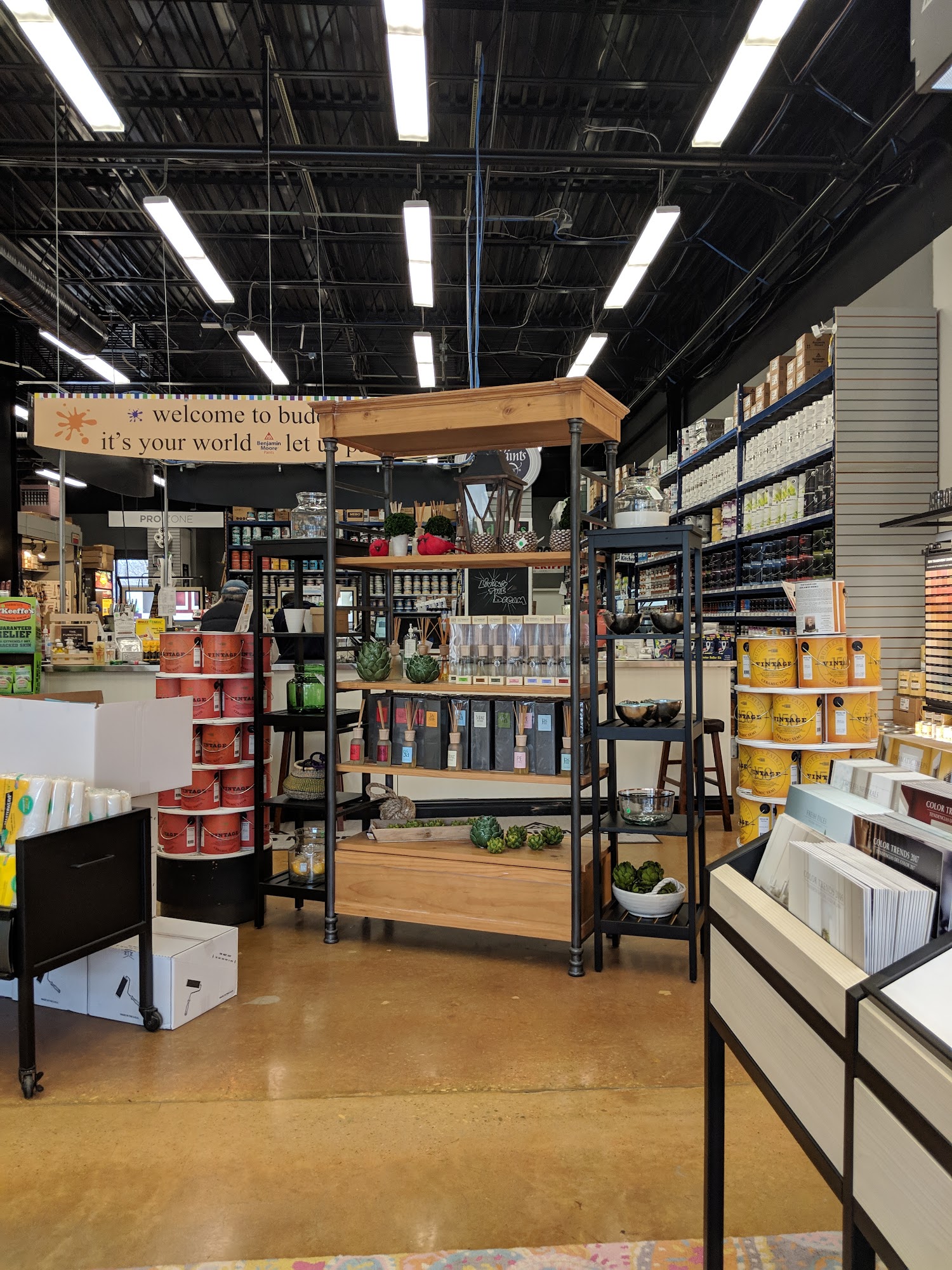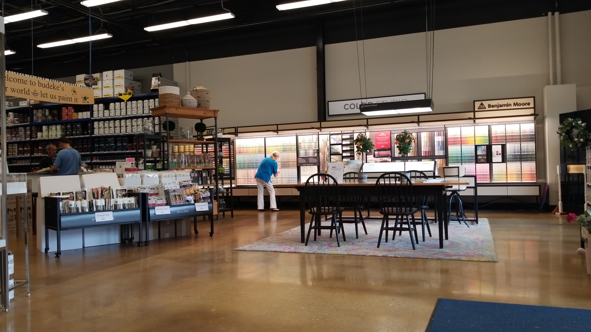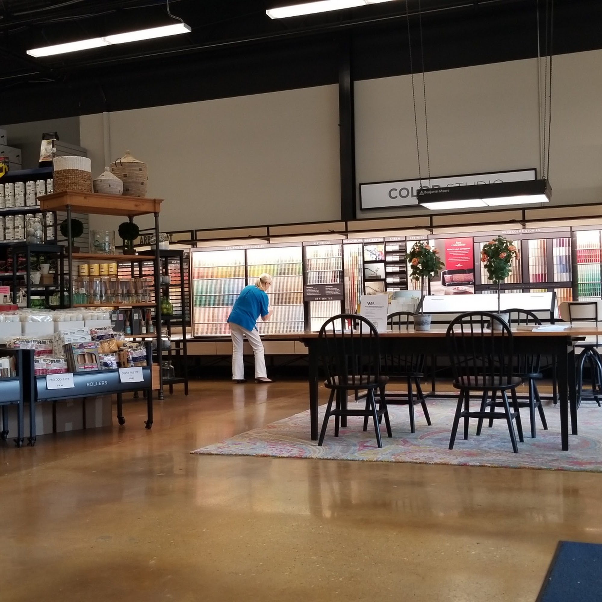 The paint store best paint store with patient staff and committed to helping customers. Large selection of paint, wallpaper, books, table space to work from. Employees spent a lot of time getting color exactly right. Customer service beautiful and impressed. Prices not very transparent and many painting supplies do not have price tags. Benjamin Moore company had incorrect formula on website and two different employees on two days spent time. One negative is not very transparent price.