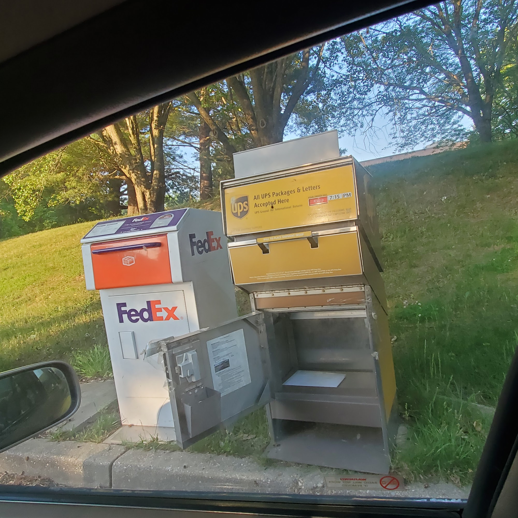 Broken open when trying to drop off a package on a Sunday.