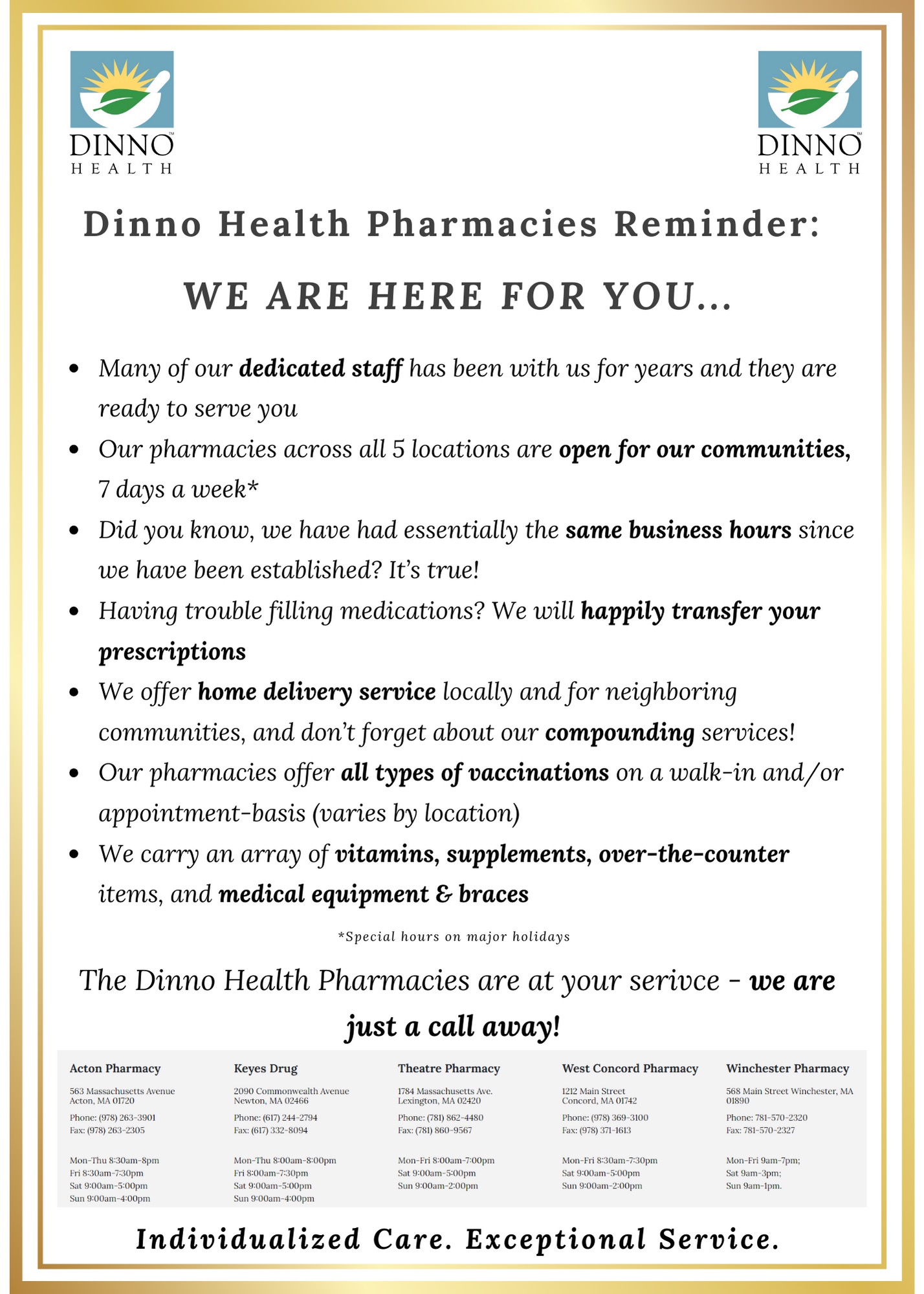 Acton Pharmacy is a local community pharmacy that is committed to providing the highest quality of care for each customer. Owned by brothers and pharmacists Saad and Raied Dinno, Acton Pharmacy offers prescriptions, compounded medications, medical supplies, homeopathic remedies, and a full line of vitamins, supplements and vaccines. Our pharmacists – some of whom have worked at the pharmacy for decades – are passionate about providing individualized care, including one-on-one counseling for prescriptions and health issues, and care coordination to ensure that prescriptions are authorized and expedited. An accredited compounding pharmacy, we provide compounded medications tailored to the needs of each individual.