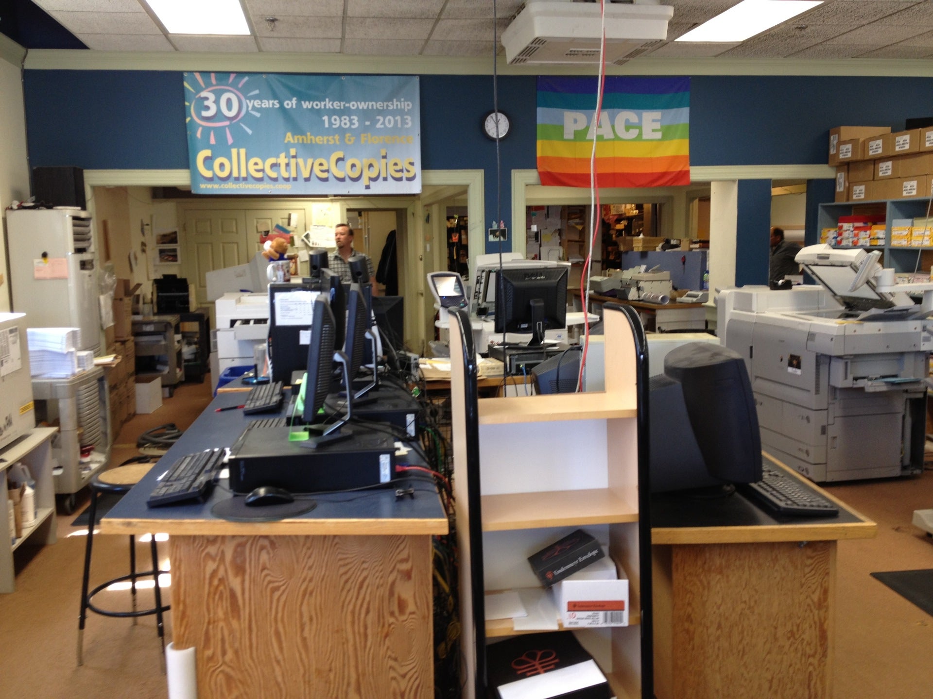 If you need just a few copies, or design help for a sign, or a cover, or a banner, οr a self published book, or a Calendar, these are the right folk. Oversuzed, undersized full color, cut, stapled, finished. Not only friendly, helpful, smart and skilled, they run as a cooperative. Everything is right.