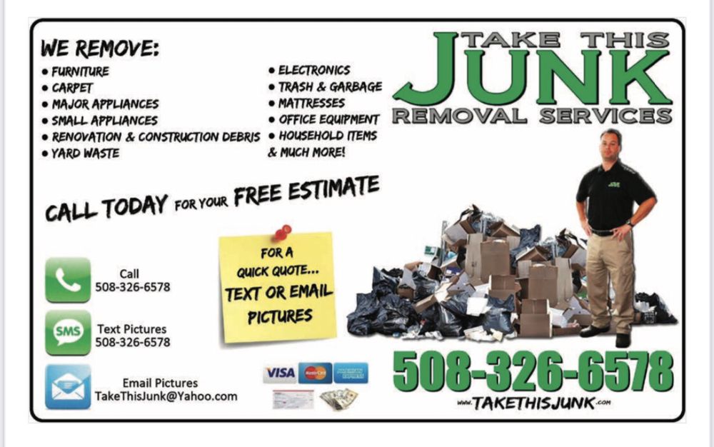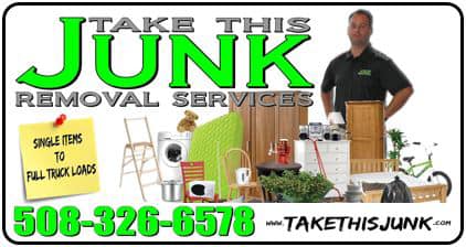 Take This Junk is a fully insured, family owned and operated Junk Removal business. We offer the highest quality service for a fair, affordable price. We dispose of your unwanted property safely and legally and we always leave you satisfied when the job is completed. Take This Junk does the dirty work, so you don't have too. You point to the Junk and our uniformed, professional Junk Removal Technicians will take all of your unwanted Junk away, so you don't have to deal with it. Our service area includes Attleboro, North Attleboro, Plainville, Foxboro, Mansfield, Norton, Seekonk, Rehoboth, Dighton, Cumberland, Lincoln, Pawtucket and The Surrounding Areas. If you have unwanted Junk, WE CAN HELP!