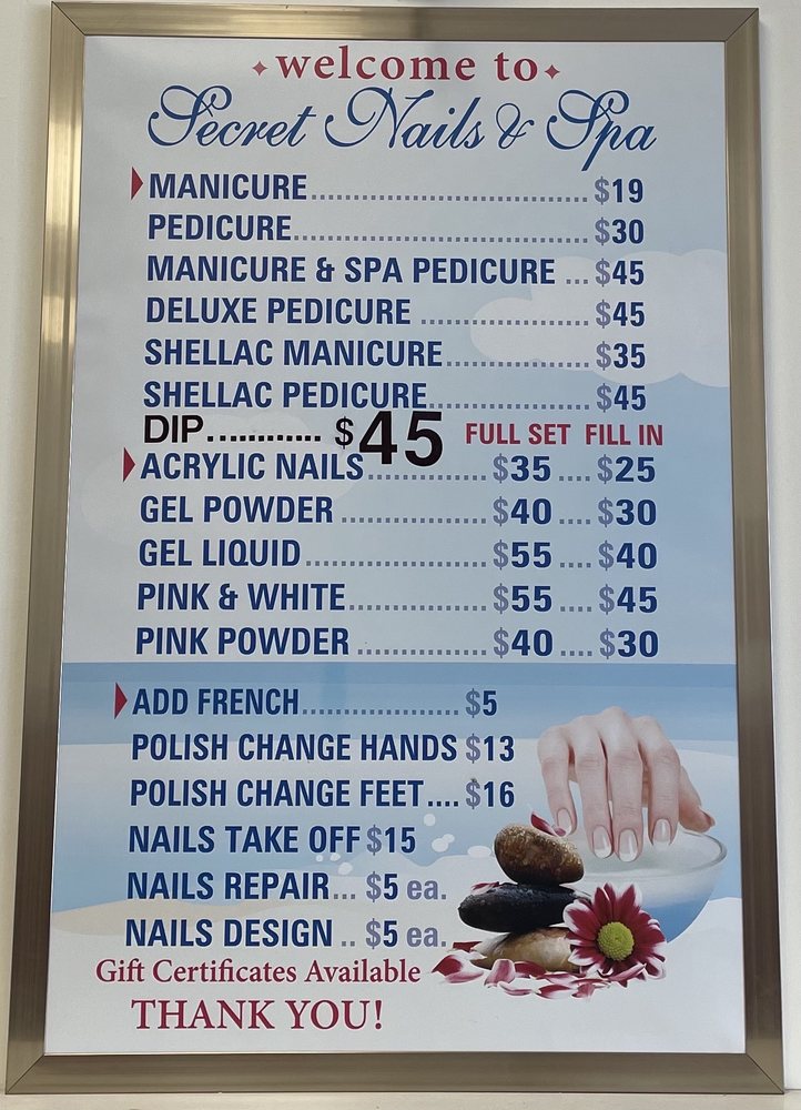 Secret Nails & Spa prides itself on providing a relaxing and rejuvenating experience for its clients. The salon's goal is to offer exceptional customer service and satisfaction. Reviewers have praised the friendly and professional staff, with some mentioning specific technicians who have gone above and beyond. The salon's attention to detail is highlighted, with one reviewer noting that their nails were carefully taken care of to avoid damage. The spa offers a range of services, including gel manicures, pedicures, and nail care. While some reviewers have expressed minor disappointments, overall the salon is described as welcoming and professional, with a focus on providing a high-quality experience for its clients.